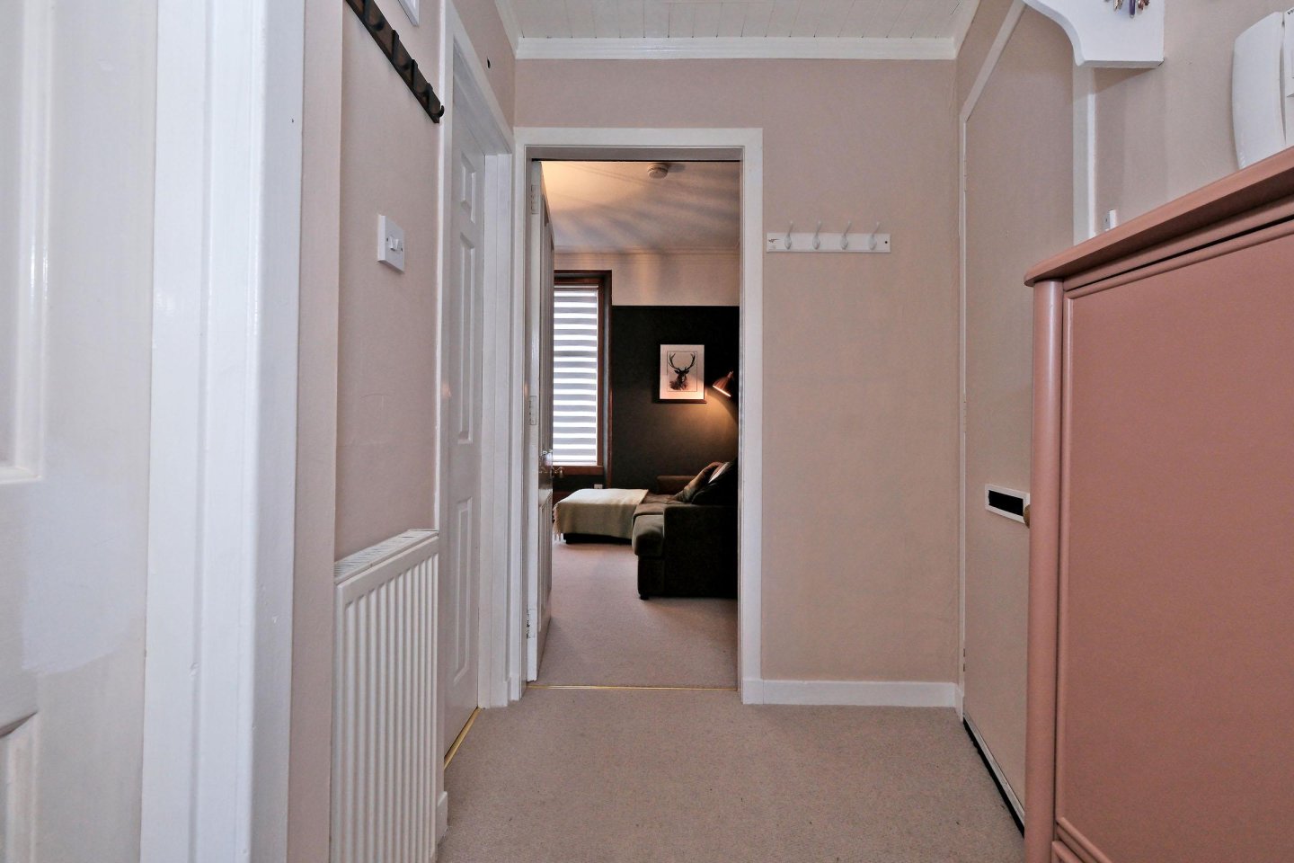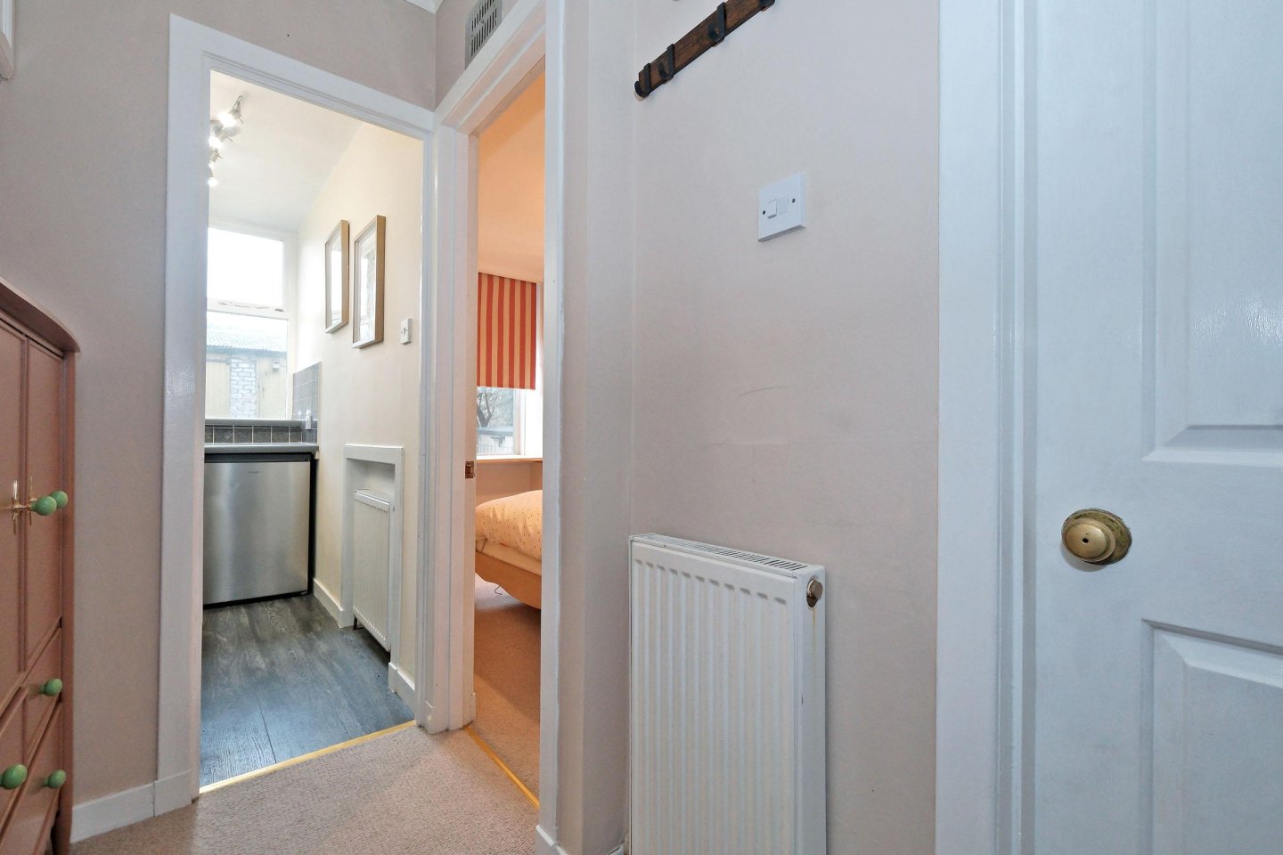 Entrance Hallway: Wooden door leads from the communal hallway into the Entrance Hallway. High level cupboard housing the electric circuit meter. Fitted carpet. Single radiator. Central light fitment set in panelled ceiling. White panelled doors lead to the other rooms.