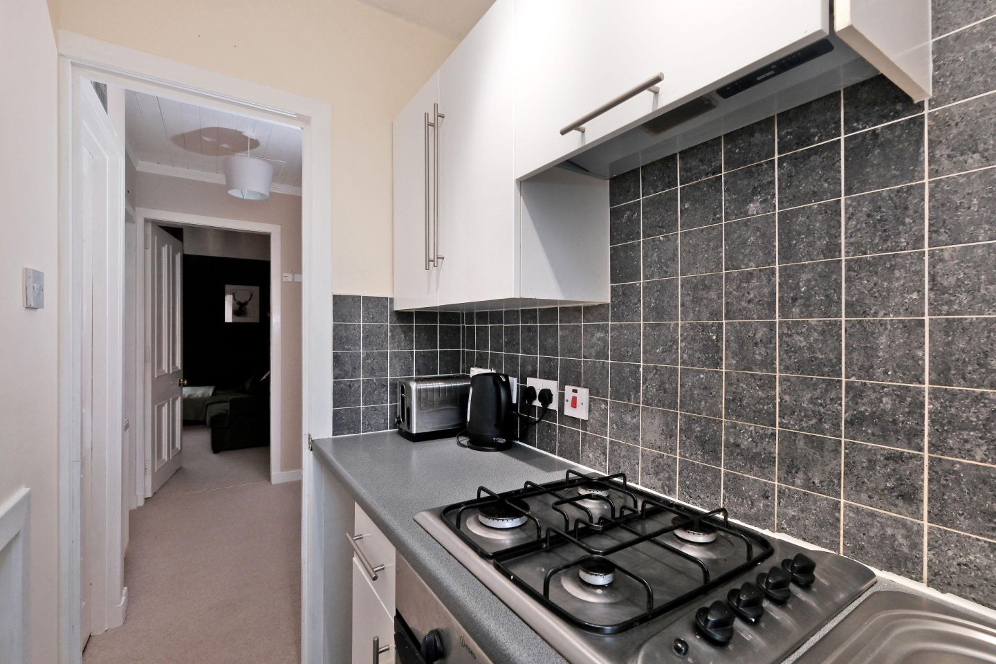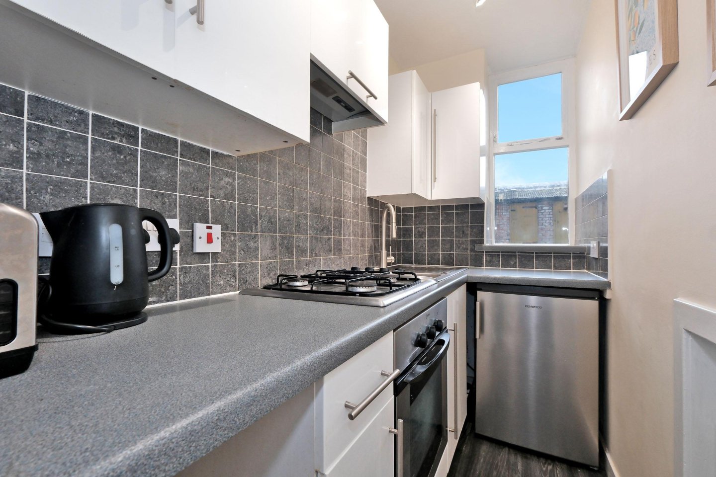 Kitchen: 2.44m x 1.22m (8’ x 4’) approx. White wall and base units with contrasting grey worktops and grey splash back tiling. Integrated oven/grill with four ring gas hob. Stainless steel sink and drainer with mixer tap. Window, with horizontal blinds, overlooking the rear garden. Grey laminate wood effect flooring. Single radiator. Strip light. Kenwood fridge to remain.