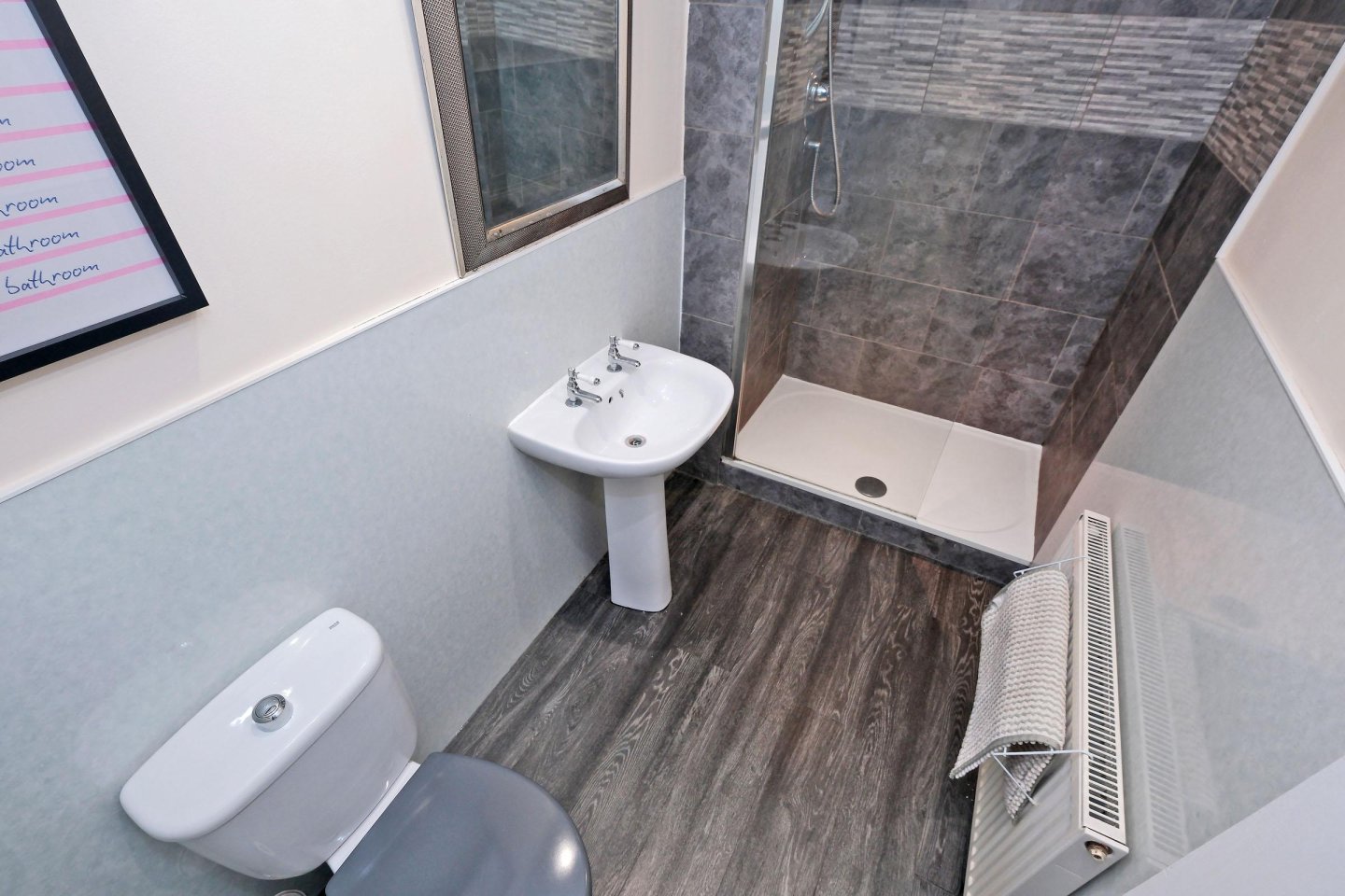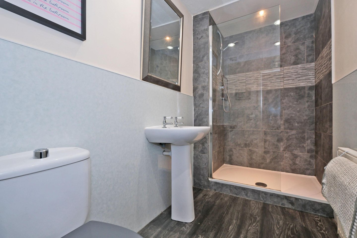 Shower Room: 3.40m x 1.37m (11’2” x 4’6”) approx. White two-piece suite with WC and wash hand basin. Walk-in shower with glass panel. Aqua panelling to dado level and ceramic tiles in the shower. Grey laminate wood effect flooring. Single radiator. Recessed spotlights. Extractor fan. Usual fitments to remain.