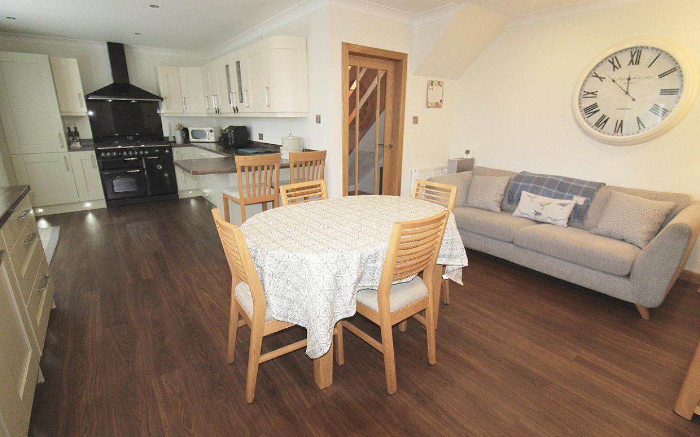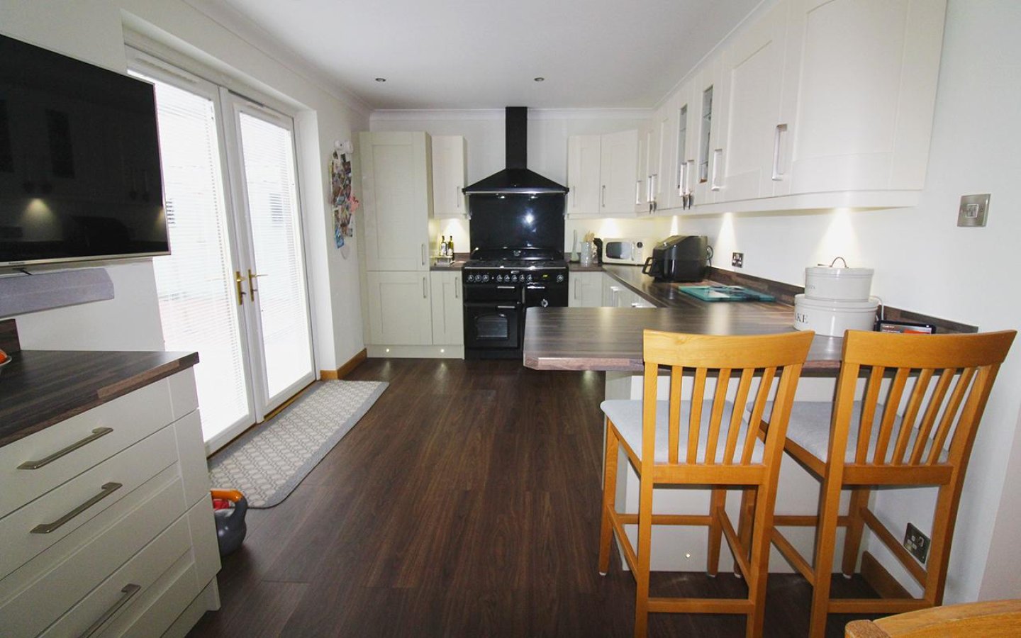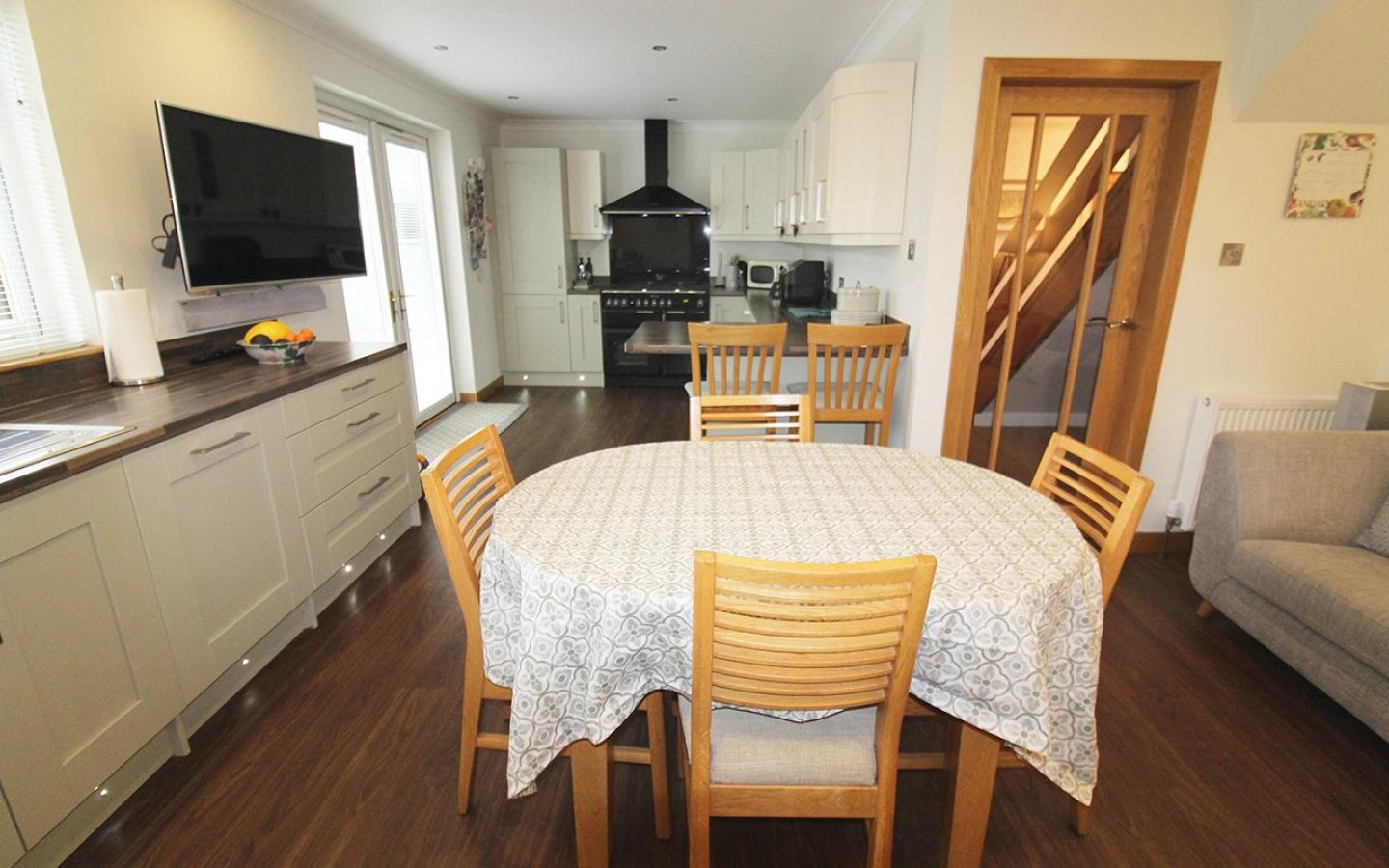 The open plan kitchen/family room is a fantastic space providing a large kitchen with ample space for a dining set and sitting room furniture. French doors open from the kitchen directly onto the patio in the rear garden. The kitchen is fitted with a large selection of two toned base and wall mounted shaker style units with wood effect worktop, upstands and breakfast bar area. Integrated appliances include a fridge/freezer, dishwasher and gas rangemaster electric oven with double oven, grill, 5 gas burners and an extractor above. A stainless steel 1 ½ sink with drainer and mixer tap sits below a window overlooking the rear garden. The kitchen/family room is decorated in neutral tones with spot lighting and moduleo flooring. The kitchen accesses the rear vestibule which has a uPVC door to the rear garden, a door to the utility room and a sliding door into the garage. The utility houses the boiler and has plumbing for a washing machine and space for a tumble under the fitted worktop.