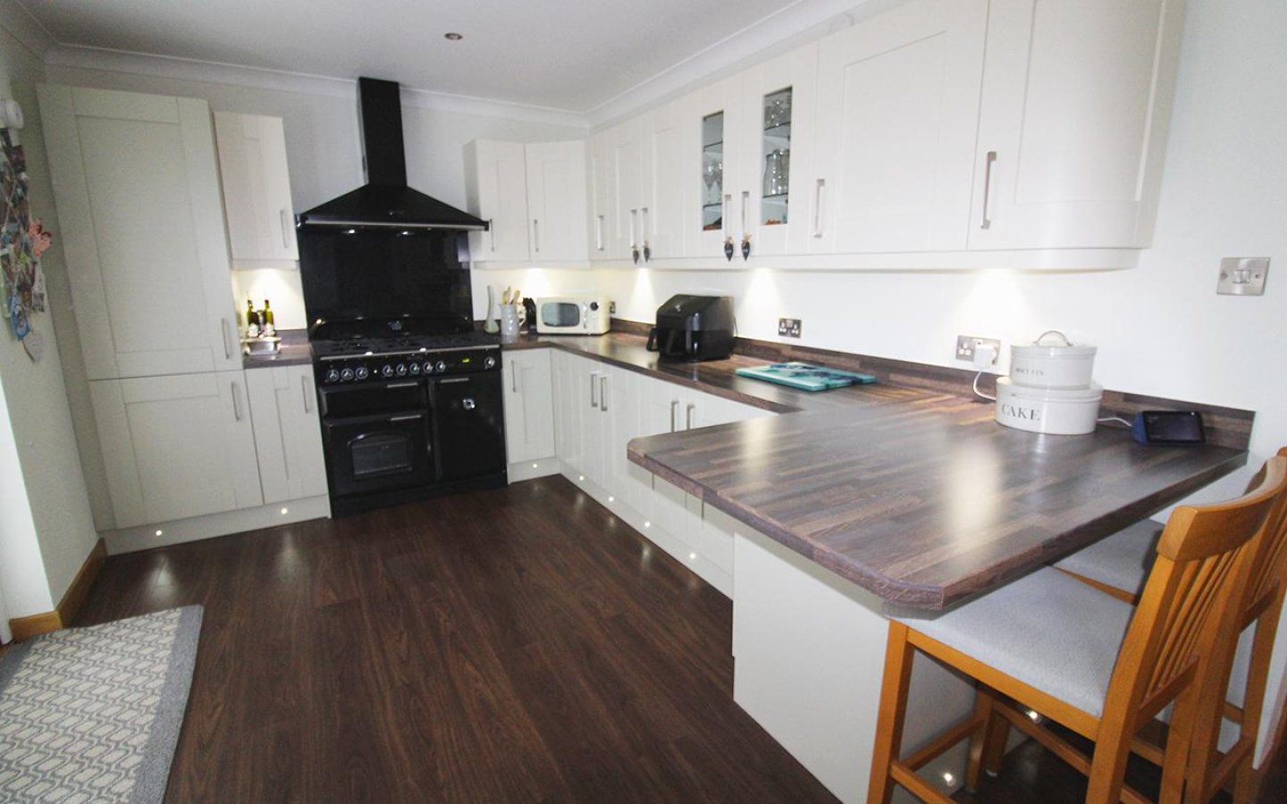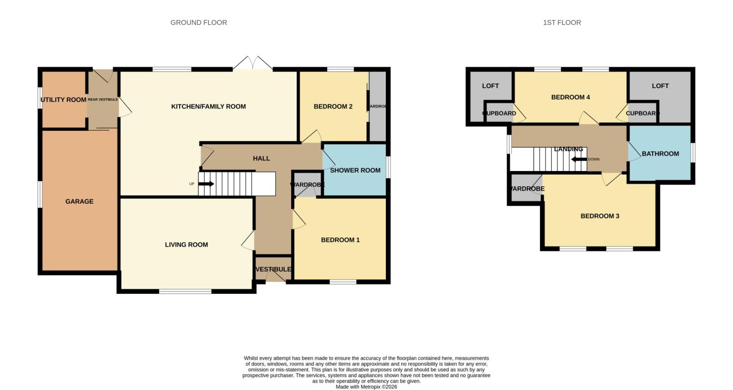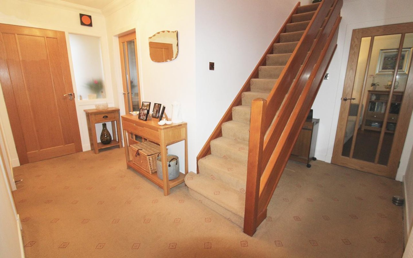 The open plan kitchen/family room is a fantastic space providing a large kitchen with ample space for a dining set and sitting room furniture. French doors open from the kitchen directly onto the patio in the rear garden. The kitchen is fitted with a large selection of two toned base and wall mounted shaker style units with wood effect worktop, upstands and breakfast bar area. Integrated appliances include a fridge/freezer, dishwasher and gas rangemaster electric oven with double oven, grill, 5 gas burners and an extractor above. A stainless steel 1 ½ sink with drainer and mixer tap sits below a window overlooking the rear garden. The kitchen/family room is decorated in neutral tones with spot lighting and moduleo flooring. The kitchen accesses the rear vestibule which has a uPVC door to the rear garden, a door to the utility room and a sliding door into the garage. The utility houses the boiler and has plumbing for a washing machine and space for a tumble under the fitted worktop.