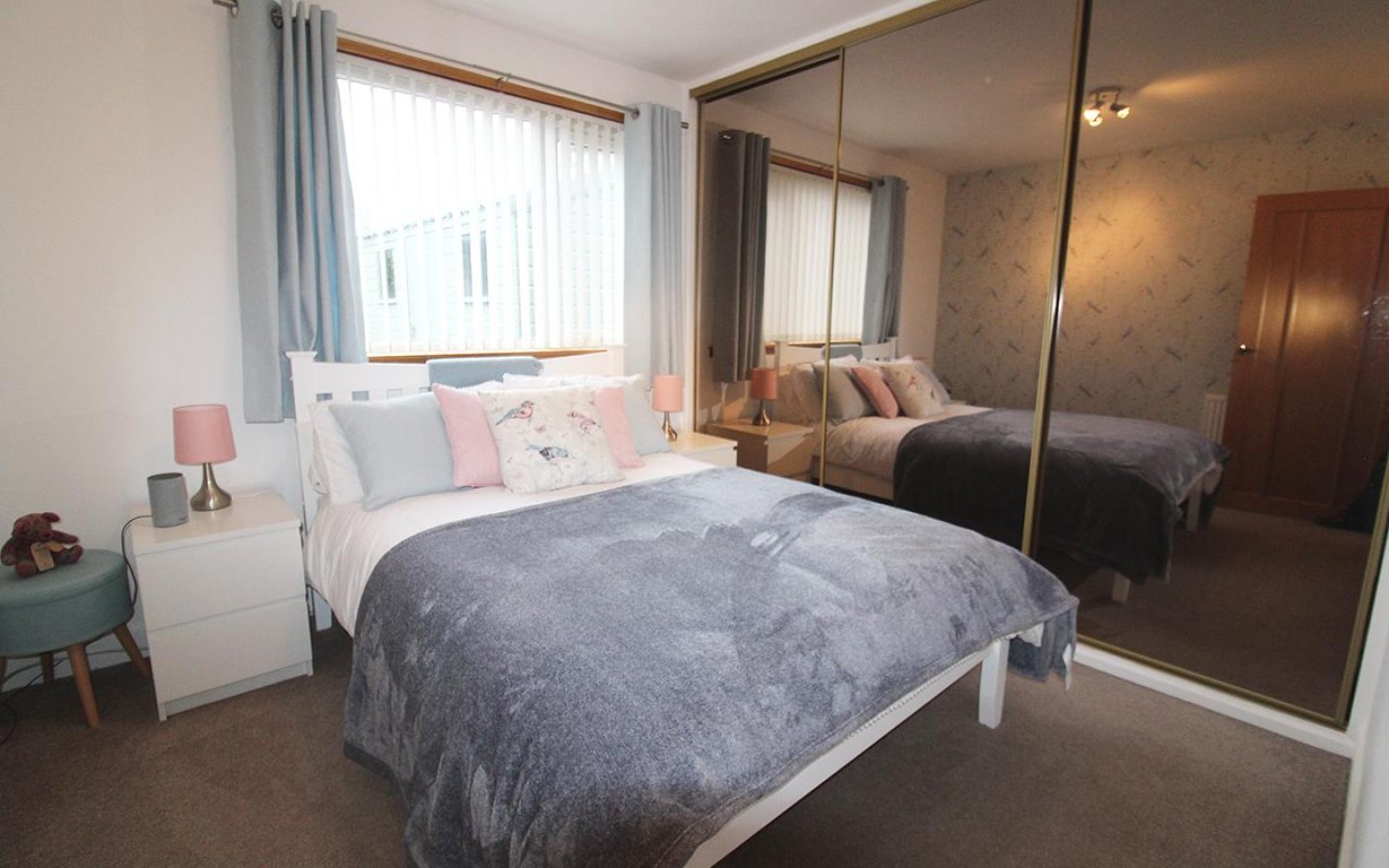 The first ground floor double bedroom has a window overlooking the front of the property and has a built-in cupboard with hanging rail and shelving. Bedroom 2 is the second double on the ground floor and has a window overlooking the rear garden. Built-in wardrobes with mirrored sliding doors offer storage by way of hanging rail and shelving. Both bedrooms are finished with fitted carpets. The shower room has a frosted window to the side, and is fully tiled with aqua panelling around shower cubicle which has a mira electric shower. The white wc and handbasin are enclosed within a storage unit. The shower room is finished with a chrome towel rail and wall mounted extendable vanity mirror.