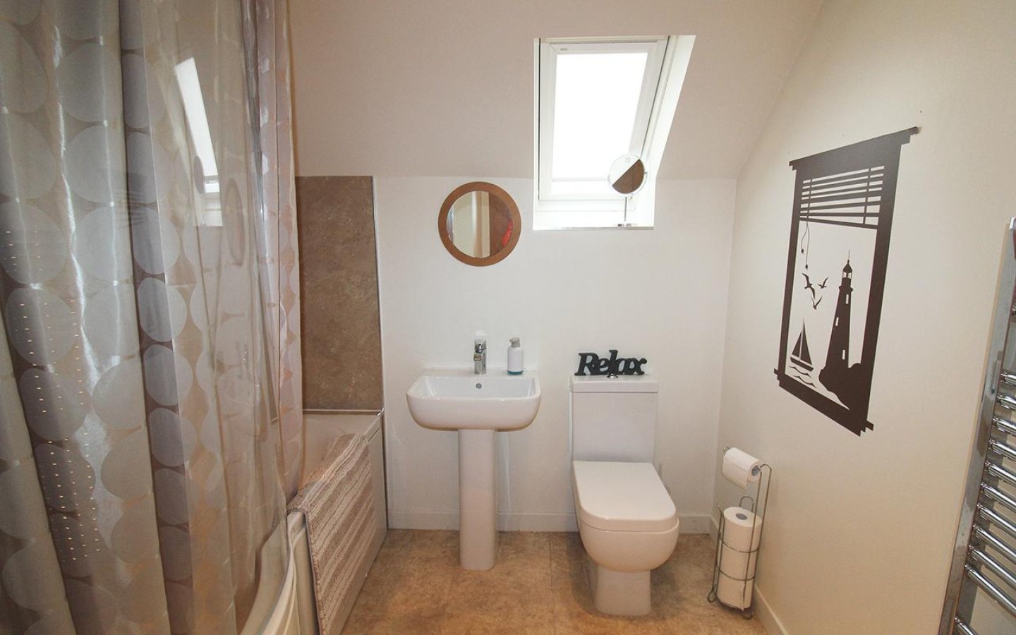 The hall carpet continues up the wooden staircase to the first floor landing which accesses two further double bedrooms and the bathroom. Storage is found in the landing via a shelved cupboard and a roof window provides natural light to the landing and staircase. Bedroom 3 has windows to the front of the property and enjoys sea views from both windows. This bedroom has a walk-in wardrobe with hanging rail and shelving. Bedroom 4 also has two windows to the rear of the property and is currently used as an office. Within bedroom 4 are cupboards either side of the room, both of which have access to the eaves loft space. The bathroom is fitted with a white three piece suite, consisting of a wc, handbasin and bath with electric mira shower. The bathroom has aqua panelling around the bath, a chrome towel rail, with a roof window to the side.