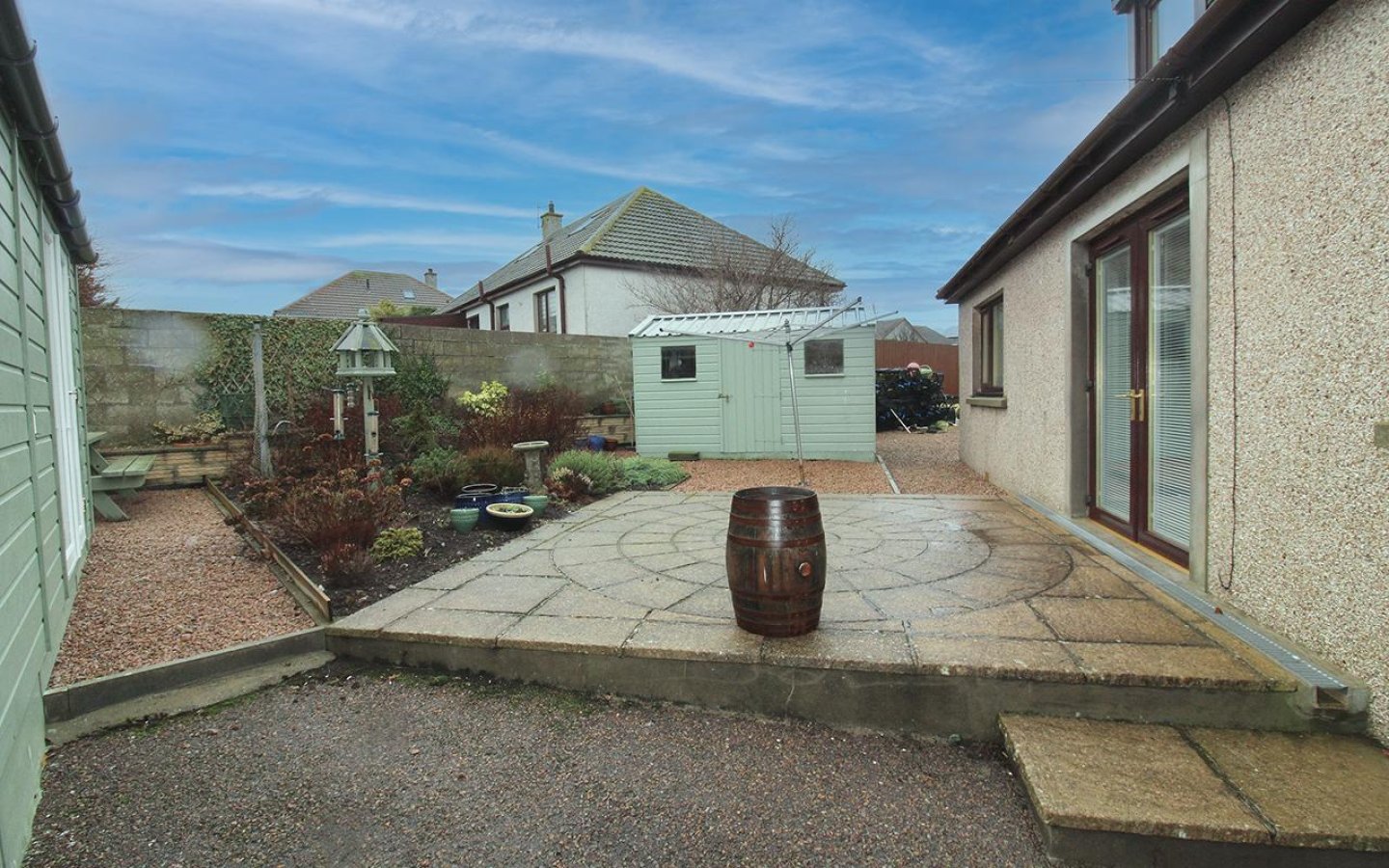 The property sits within a large plot with a tarmac drive at the front of the property which leads to an area of stone chips which has ample space for numerous vehicles. A double wooden gate at the side provides a second vehicular access point. An electric vehicle charging point has been installed at the front of the property. The rear garden can be accessed from both sides of the property as well as from the rear vestibule and directly from the french doors in the kitchen. The rear garden has an area of patio and an area of planting. Within the rear garden are a timber summerhouse with glazed uPVC double doors, a shed and an outside tap.