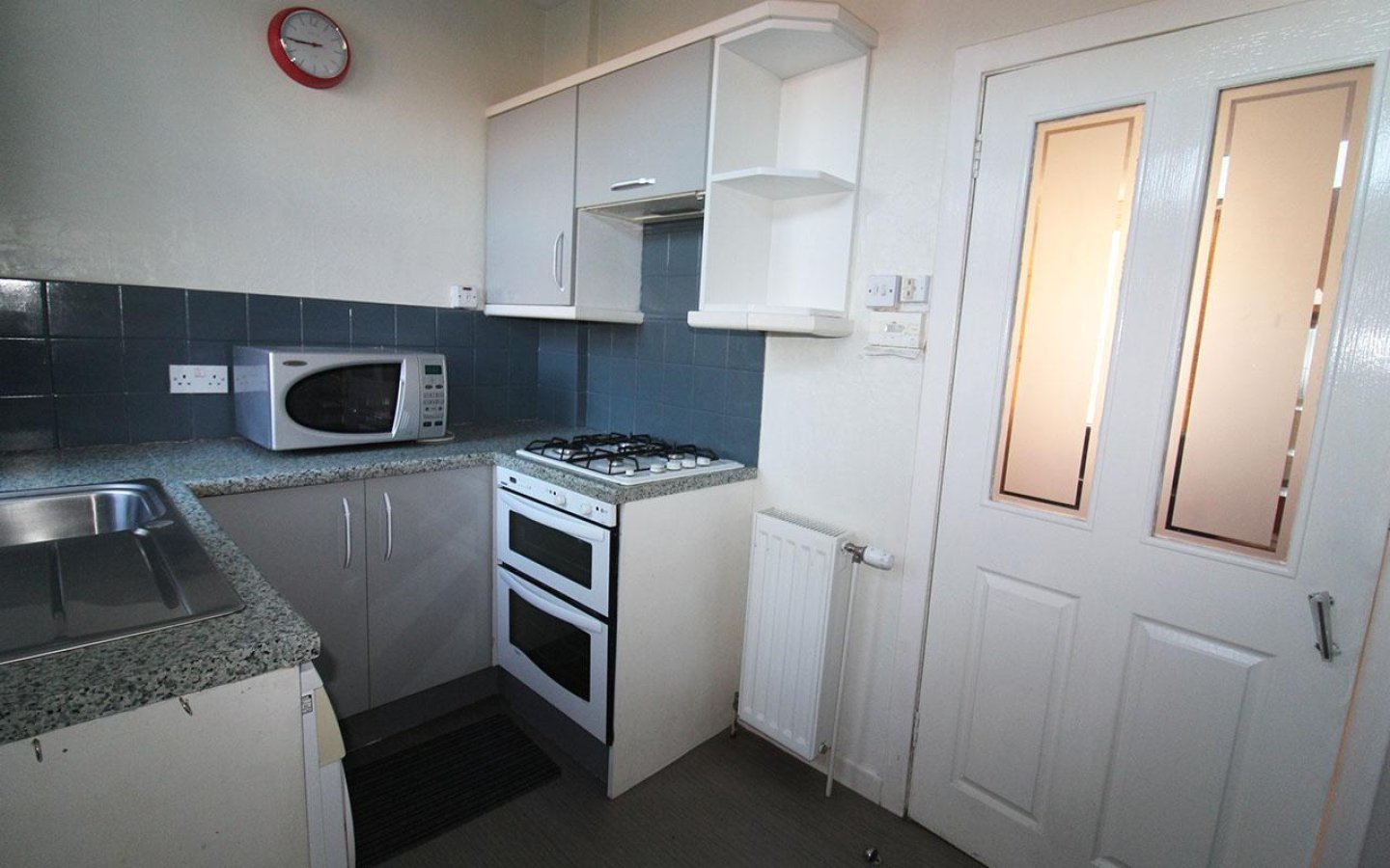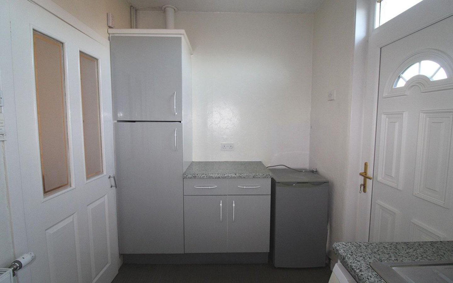 The property is accessed via a glazed uPVC door into the vestibule which in turn opens into the carpeted living room. The living room has a window to the front and a wooden fire surround housing an electric fire. Storage is found via a built-in shelved cupboard. A door from the living room leads to the kitchen and a second door to the hall.