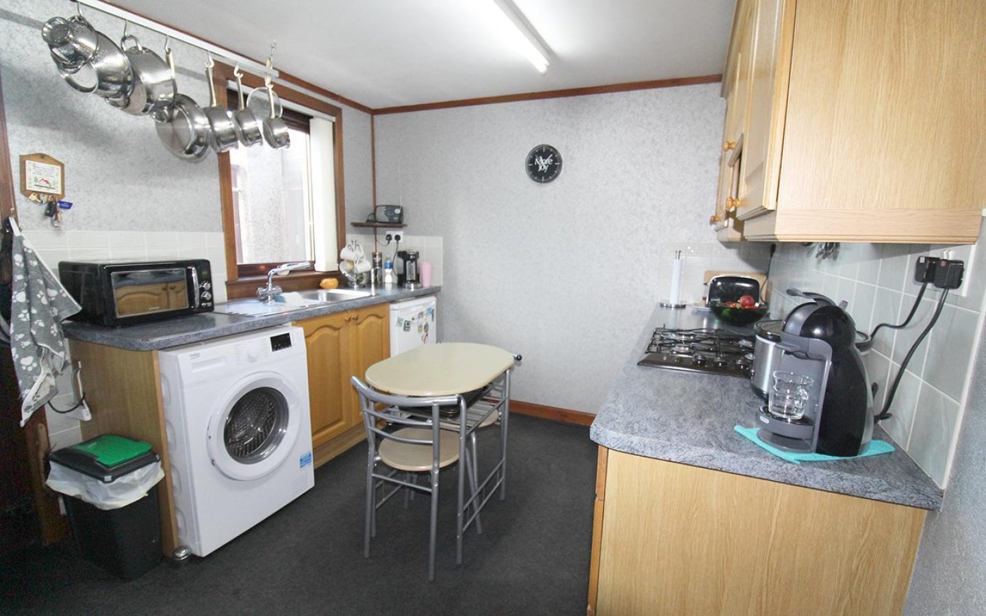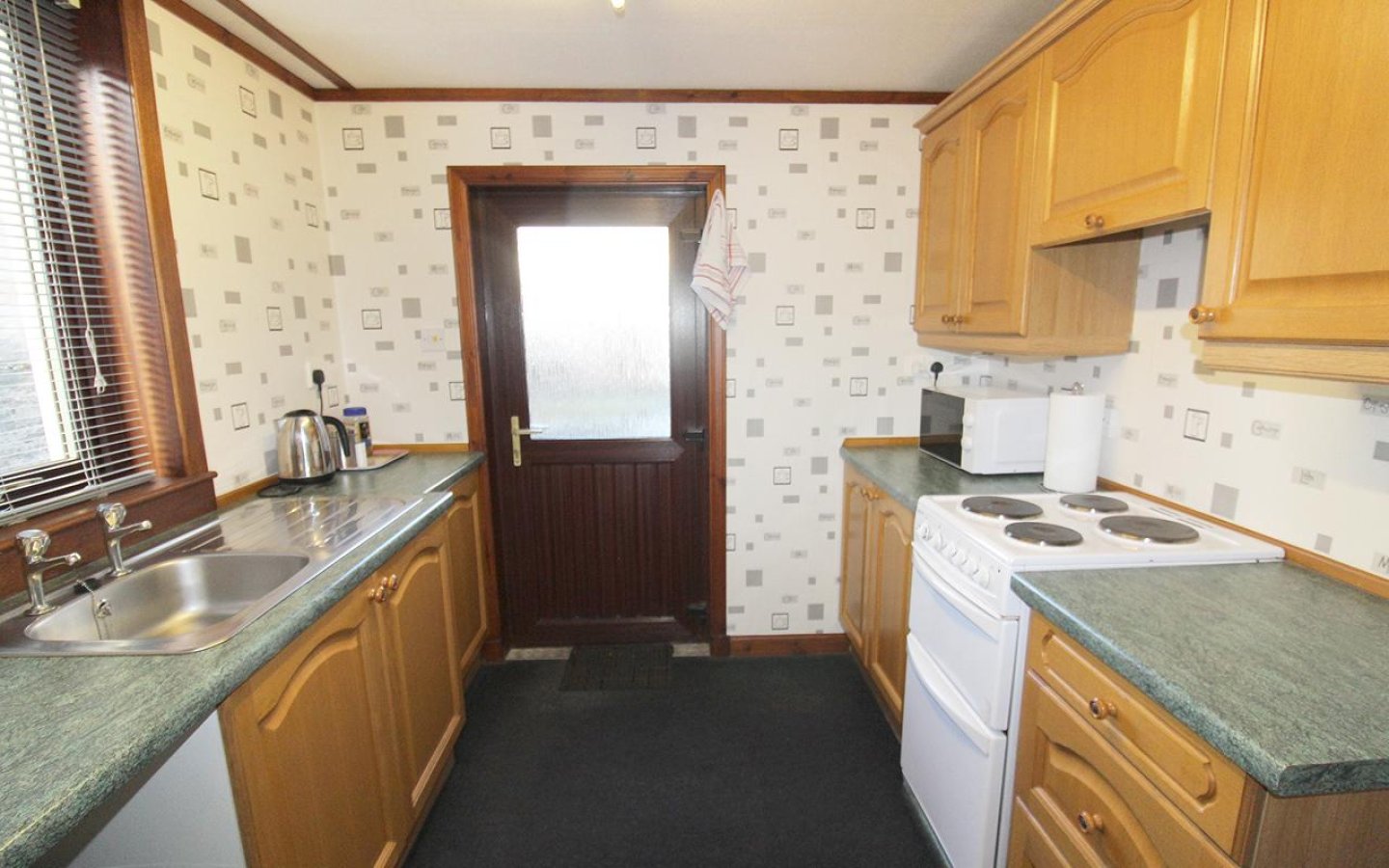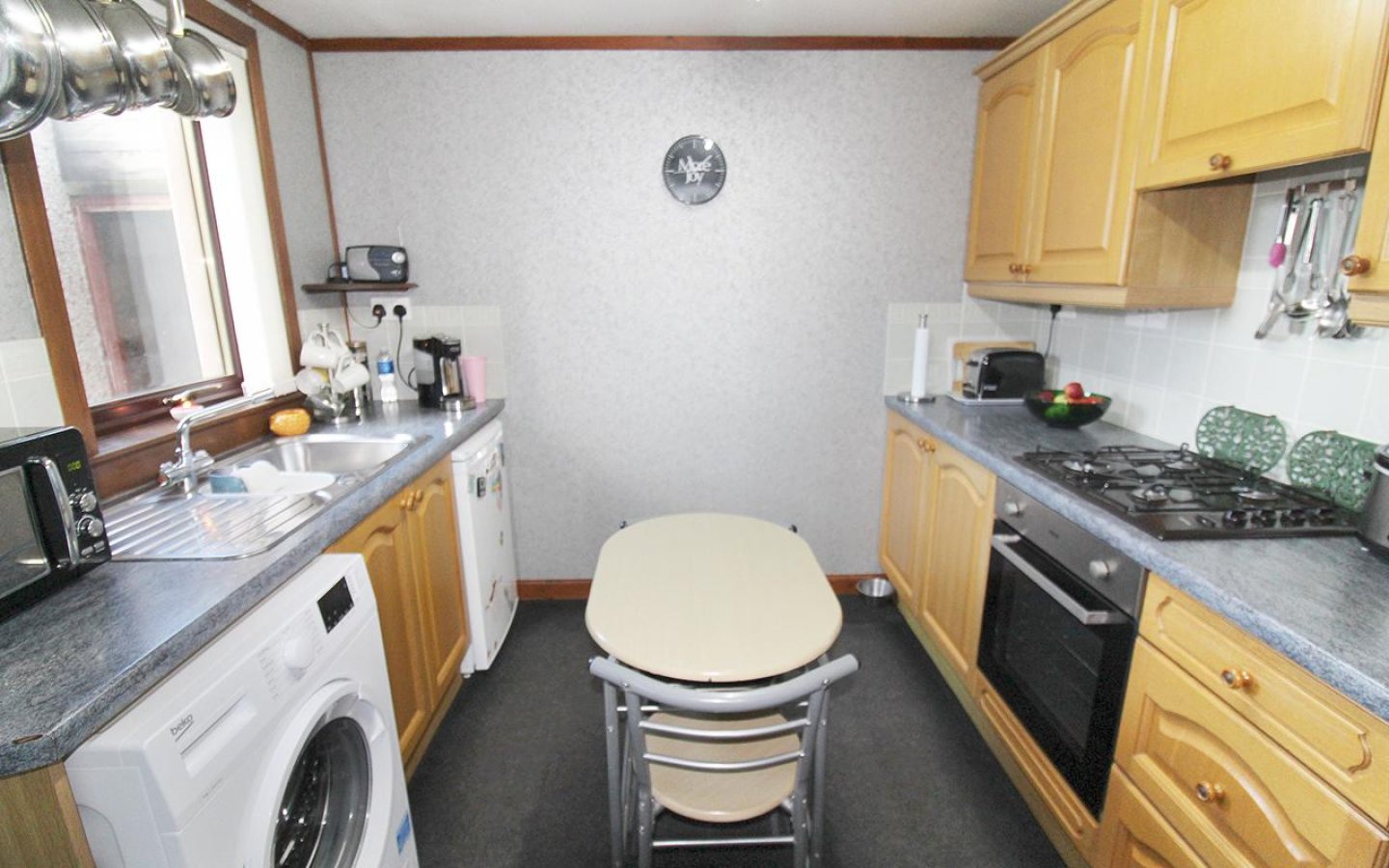 Kitchen 1 is accessed via the living room and is fitted with a selection of base and wall-mounted units with contrasting worktops and tiled splashback. A 1 ½ stainless steel sink with drainer sits under the window overlooking the rear garden. The kitchen is fitted with a electric oven, gas hob with cooker hood and extractor above. An external uPVC door opens into the garden.