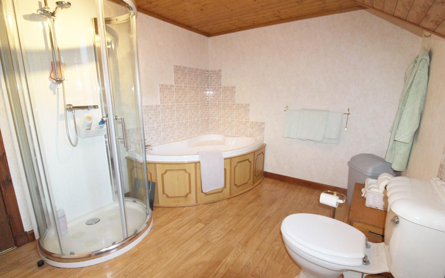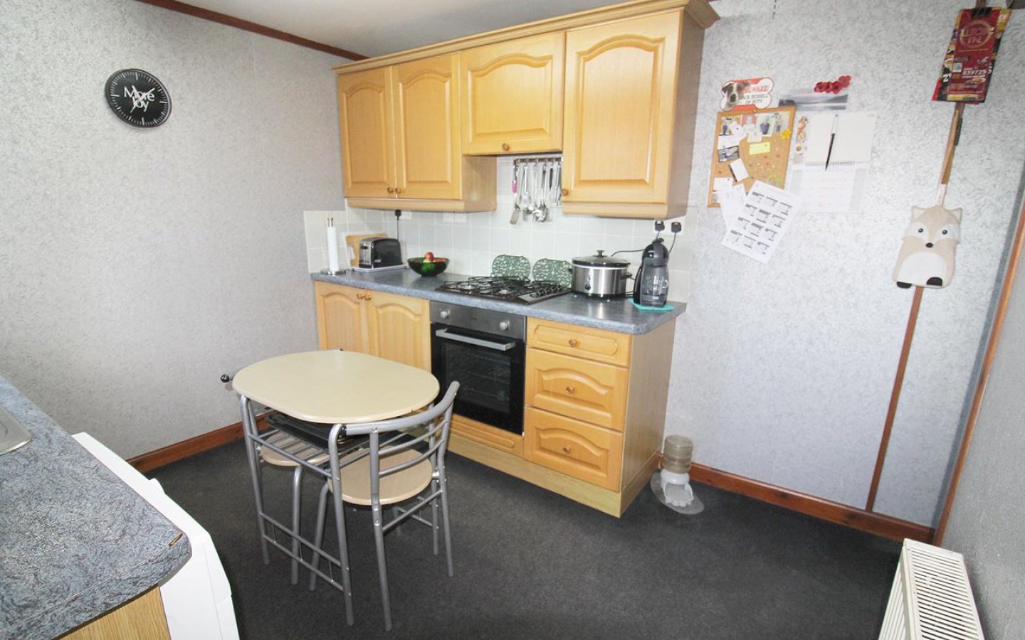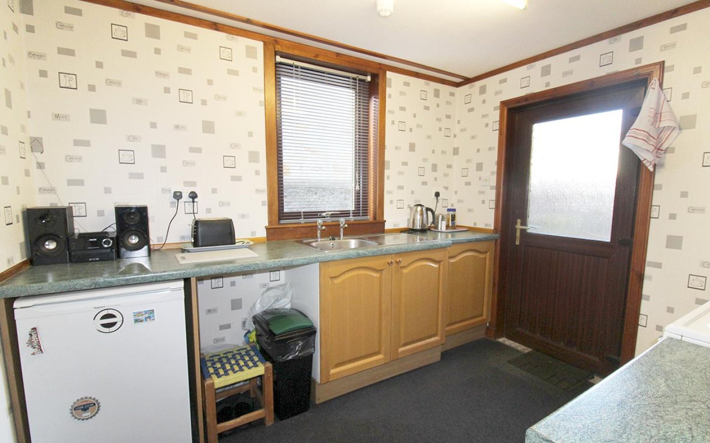 Kitchen 1 is accessed via the living room and is fitted with a selection of base and wall-mounted units with contrasting worktops and tiled splashback. A 1 ½ stainless steel sink with drainer sits under the window overlooking the rear garden. The kitchen is fitted with a electric oven, gas hob with cooker hood and extractor above. An external uPVC door opens into the garden.