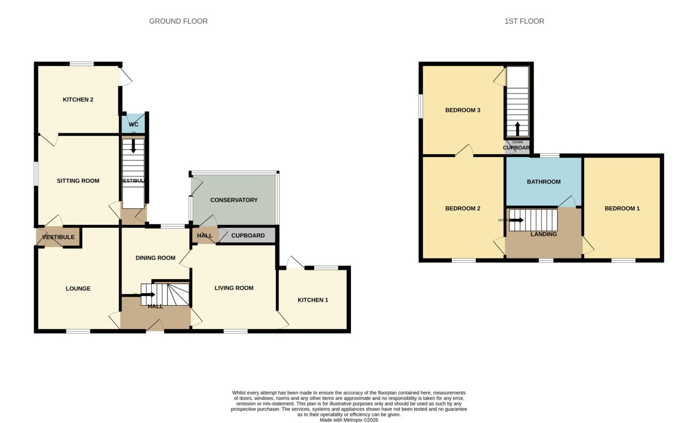 This large home offers the opportunity for multi-generational living with two kitchens giving the option for independent living within the home. Accommodation comprises, on the ground floor: living room, kitchen 1, dining room, conservatory, lounge, sitting room, kitchen 2; and on the first floor: three double bedrooms and family bathroom. All fitted carpets, floor coverings, window blinds, curtains and light fittings are included in the sale.