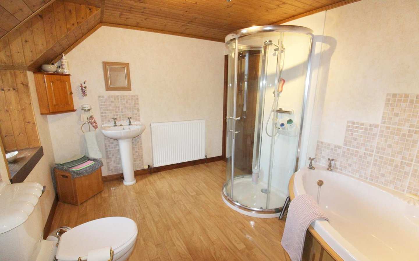 The staircase from the hall has a curved wooden handrail and metal spindles, leading up to the first floor landing. All three bedrooms are large doubles, bedrooms 1 & 2 are front facing both with fitted carpets and are accessed from the landing. Bedroom 3 can be accessed via a door from bedroom 2 or via the second staircase from the vestibule. The family bathroom comprises a white suite with WC, bath, shower cubicle, and hand basin. The shower cubicle houses a mains shower with aqua panelling. The bathroom has a laminate floor, the usual bathroom fittings and frosted window to the rear providing natural light.