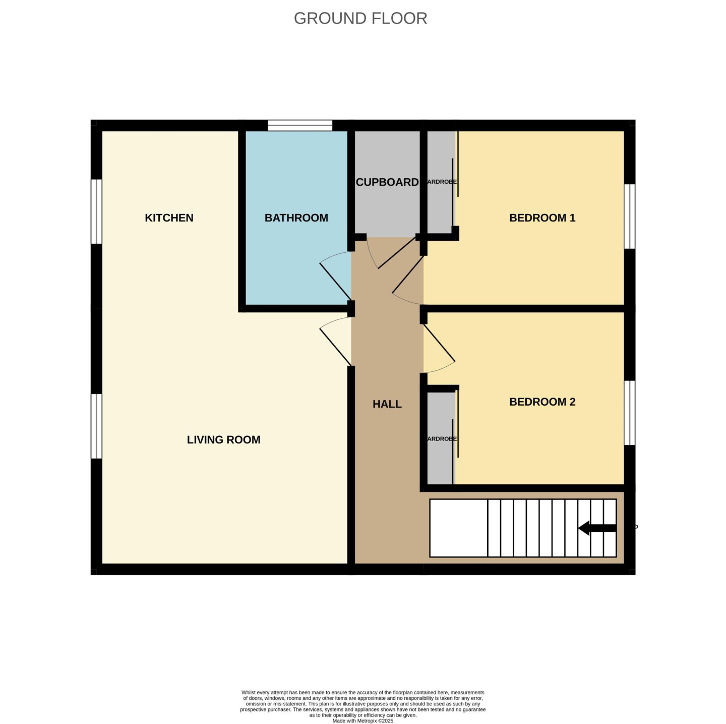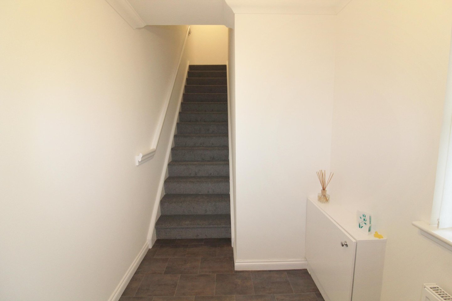 The property is accessed via a ground-floor wooden door into the vestibule, which connects to the internal carpeted staircase ascending to the hall. The hall provides access to all the accommodation via white wood-panelled doors. A large storage cupboard, housing the boiler, is located within the hall. The fitted carpet from the staircase continues through the hall, living room, and both bedrooms.
