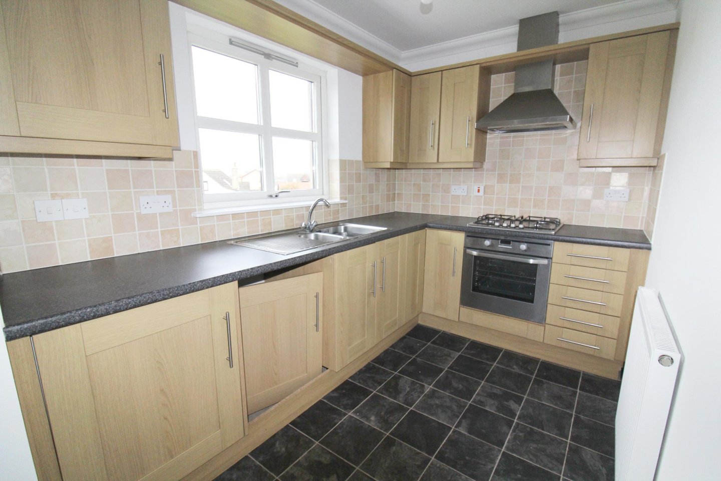 The open-plan living room is a spacious area with rear-facing windows and fitted carpet, while the kitchen area features complementary vinyl flooring. The kitchen is fitted with a selection of base and wall-mounted units with contrasting worktop and tiled splashback. An inset 1 ½ stainless steel sink with drainer and mixer tap sits below the rear-facing window. Integrated appliances included a fridge, electric oven, gas hob, and extractor hood. There is space for a washing machine.