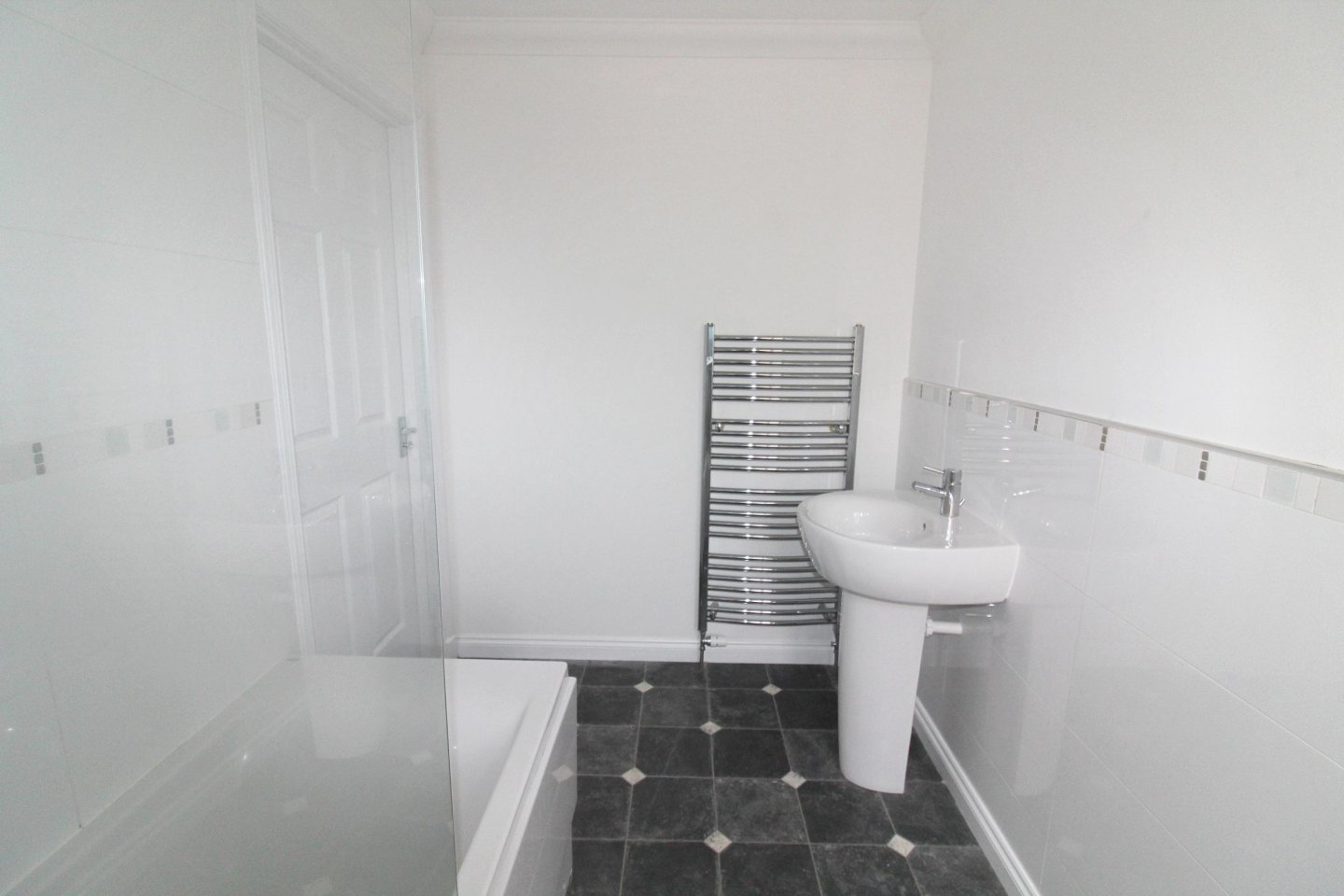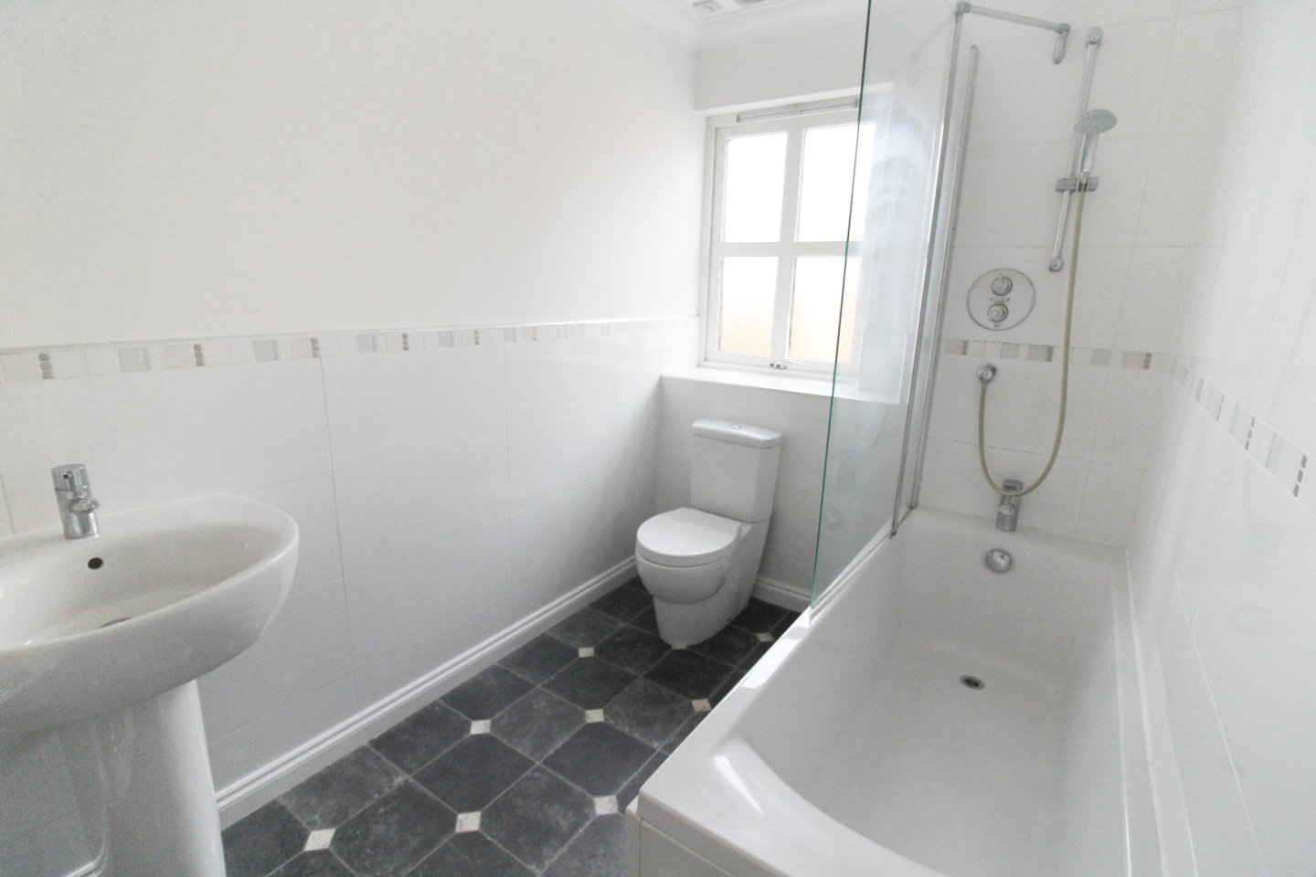 The bathroom is fitted with a white suite comprising W.C, hand basin, and bath with mains shower. The walls are tiled around the shower and to dado height around the remainder of the room. Additional features include a chrome towel rail, vinyl flooring, and a frosted side-facing window.