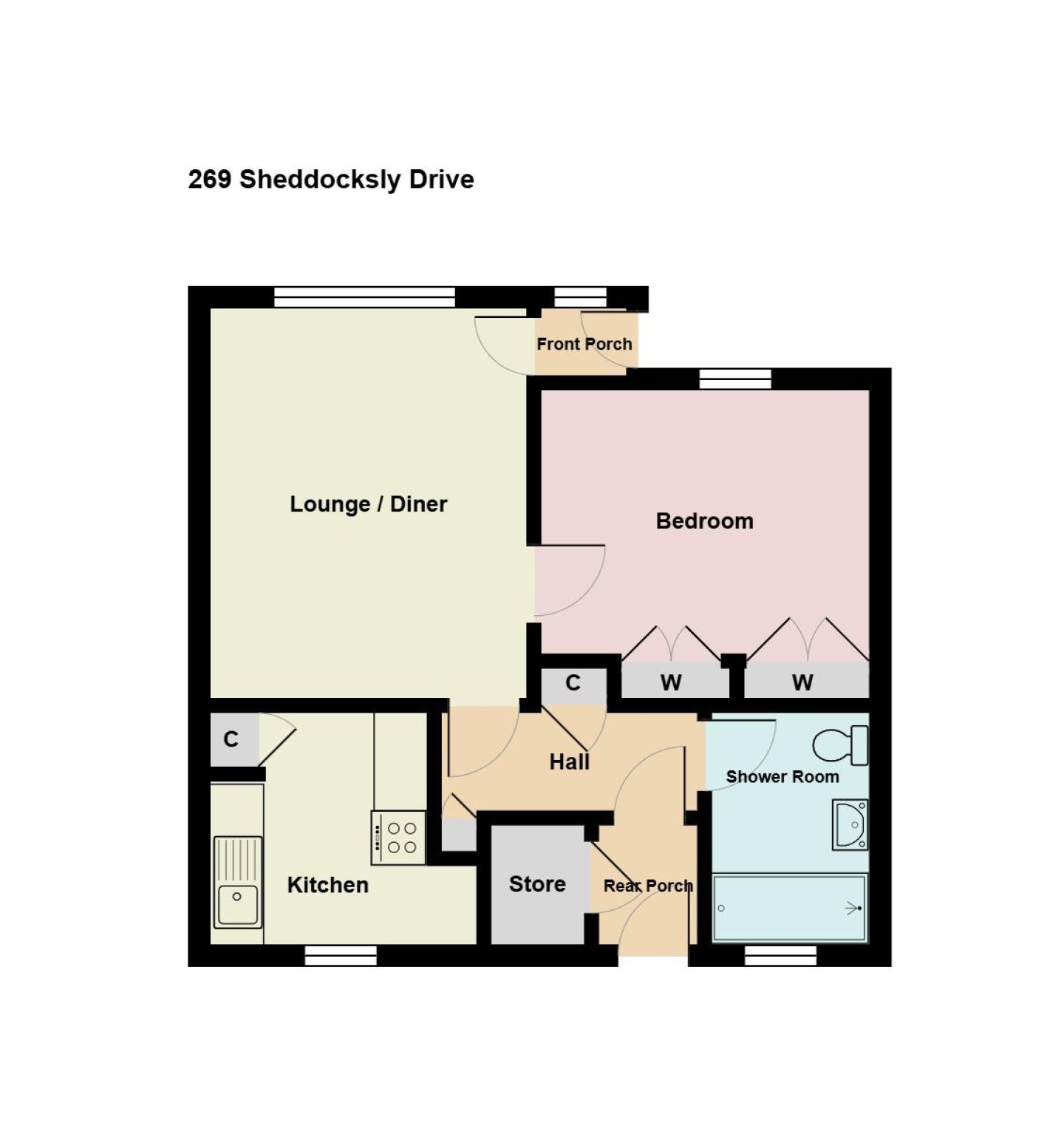 The front garden is enclosed and mostly grassed. Front border with mature shrubs. Shared pathway to front door continuing to side of house. Storm porch. Outside light.