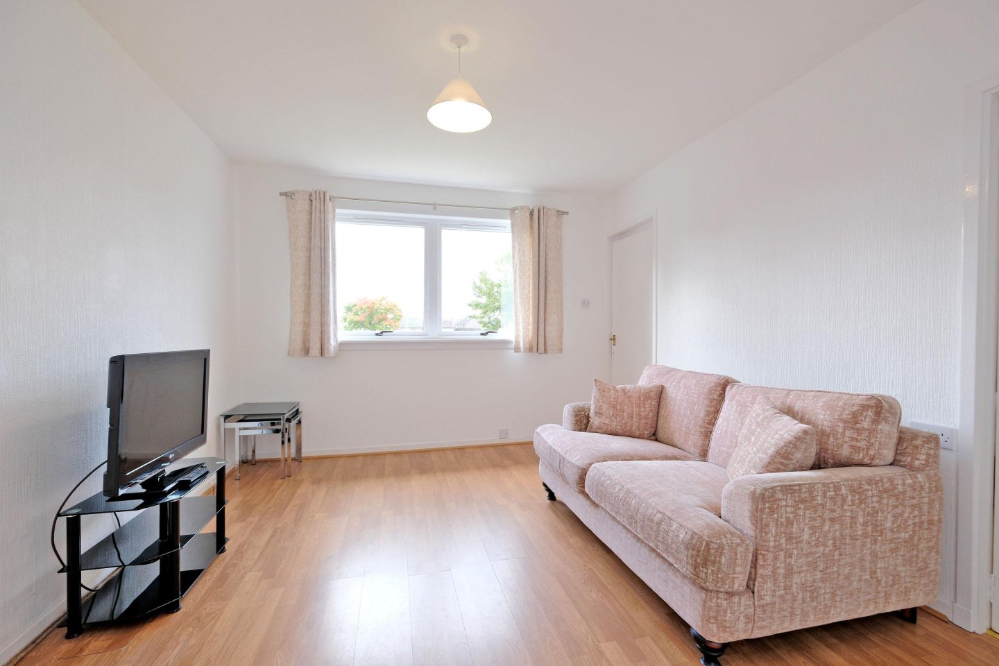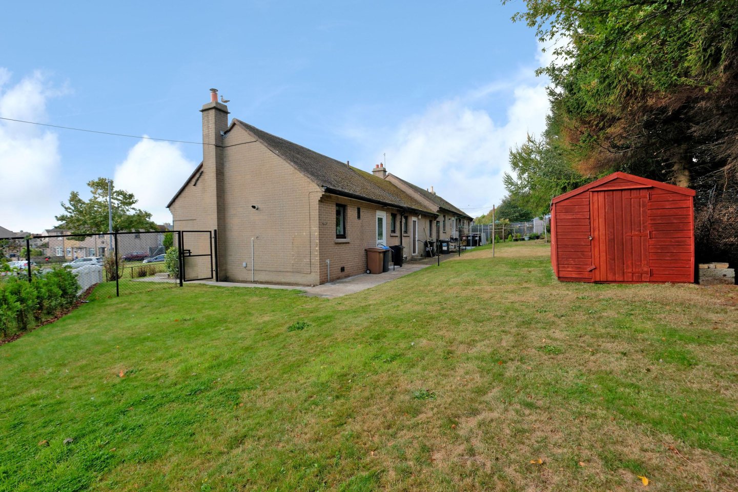 The large, rear garden is grassed. Mature trees on adjoining amenity ground provide privacy and screening. Pathway to side access gate. Garden shed. Outside light.