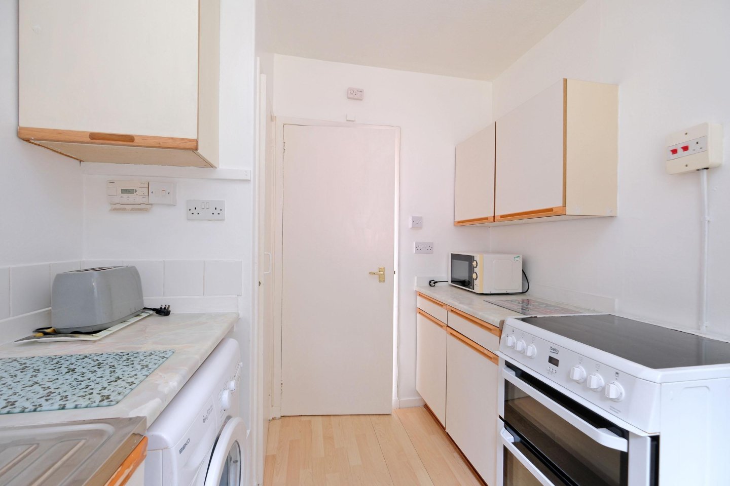 Kitchen: 2.64m x 2.16m (8’8" x 7’1") approx. Fitted with a range of base and wall mounted units with contrasting work surfaces. Ceramic tiles behind work surfaces. Window overlooking the rear garden. Laminate floor. Stainless steel sink and drainer. Beko cooker. Washing machine. Fridge/freezer. Cupboard housing central heating boiler. Ceiling light. Ample power points. Extractor fan. Central heating timer.