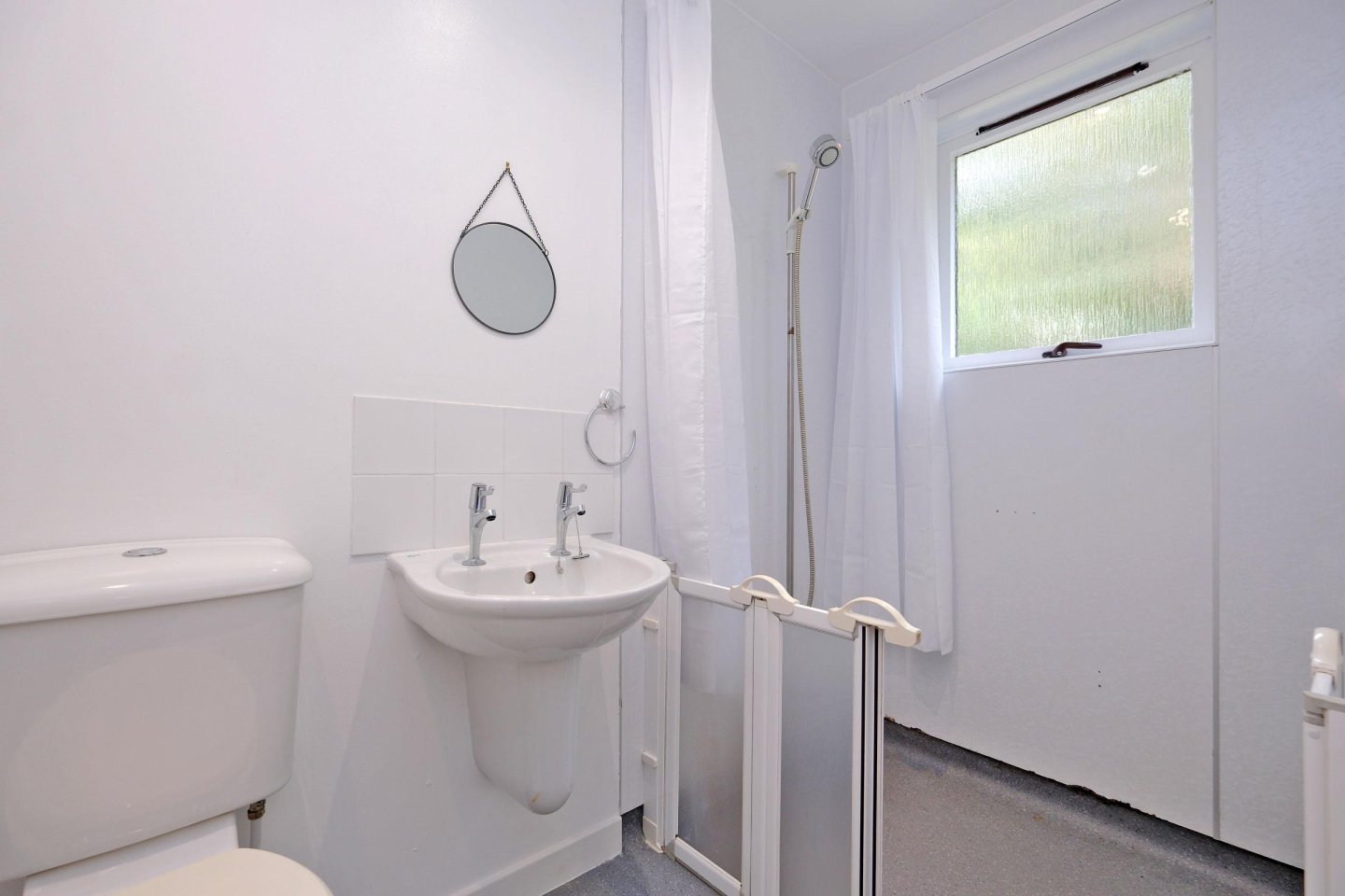 Wet Room: 2.44m x 1.68m (8’ x 5’6") approx. The Wet Room is fitted with an aqua panel shower area with curtain. Mira shower. Opaque glass rear facing window. White Ideal Standard wc and wash-hand basin. Radiator. Usual fitments including Medicine Cabinet. Ceiling downlighters.