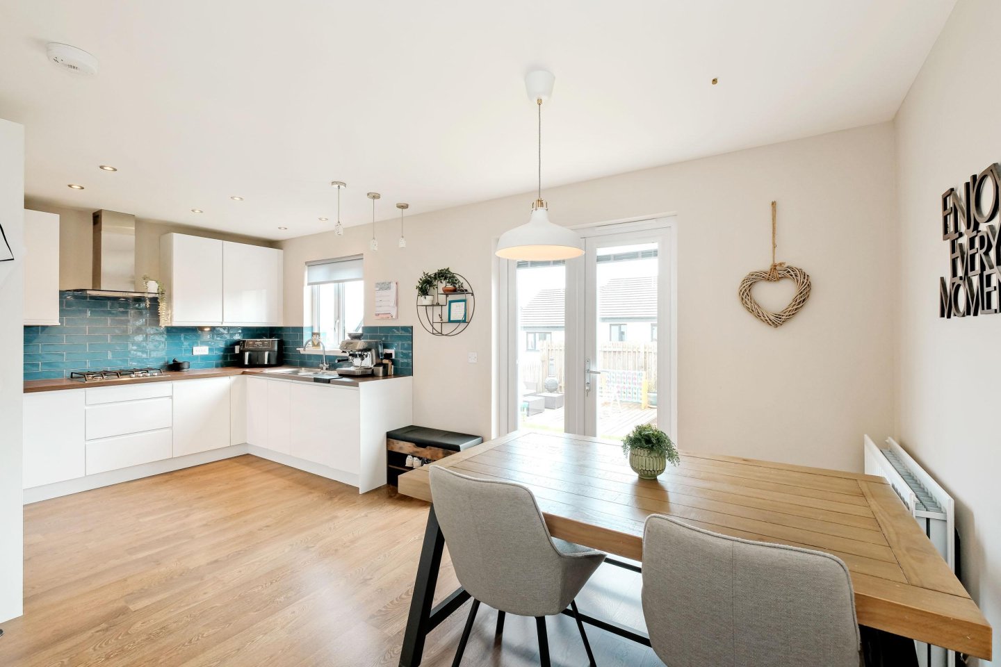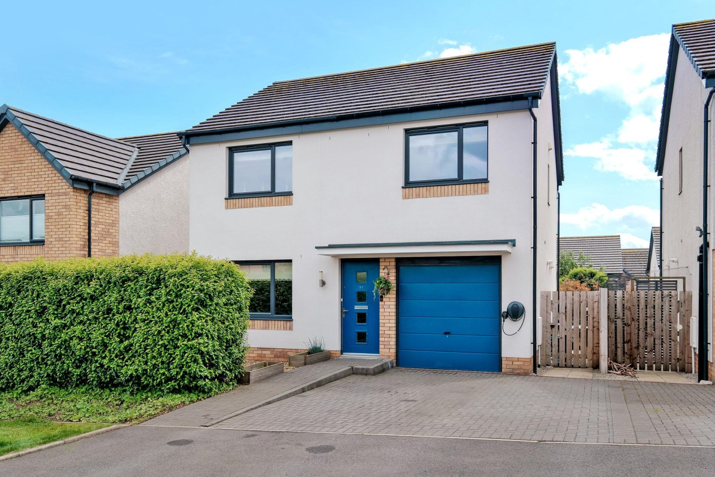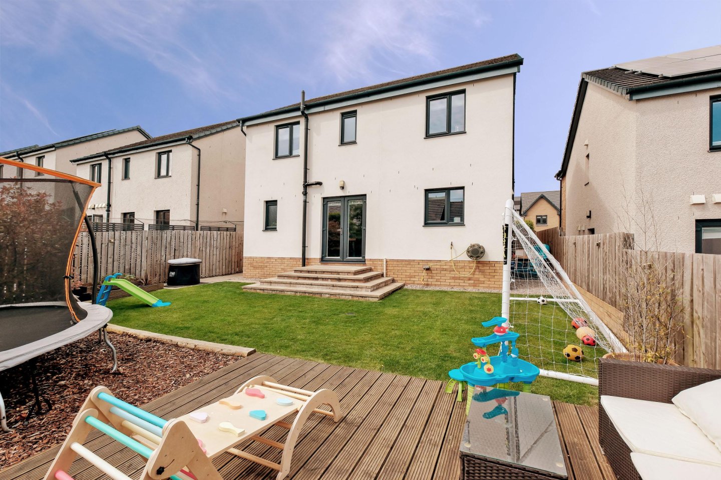On entering the property the large Lounge with window overlooking the front garden floods the room with natural light. The fully fitted Dining Kitchen is sure to be the heart of the home with sleek, High Gloss units with integrated appliances including gas hob, single oven, fridge/freezer, dishwasher and microwave. There is ample space for a dining table and chairs and the room also has a large cupboard and access to the Utility Room with washing machine and tumble dryer (both to remain) and a handy Cloakroom. French doors in the Kitchen lead to the fully enclosed south-facing Rear Garden with decked area, area with bark chippings, an ideal play-area and lawn. A side access gate leads to the front of the property. Upstairs, the Master Bedroom with built-in wardrobe with mirrored sliding doors provides considerable hanging and storage space is complemented with a luxurious En-Suite Shower Room with double sized shower cubicle and 2 piece white suite , the Guest Bedroom also benefits from built-in wardrobes, an additional cupboard and its own En-Suite Shower Room. Two further Double Bedrooms both with windows overlooking the rear garden, one of which is currently used as a Home Office, and Family Bathroom with 3 piece white suite with overbath shower completes the accommodation in this ready-to-move into dwellinghouse. All room sizes are generous and the property benefits from extensive storage with fitted wardrobes the Master Bedroom and also in the Guest Bedroom and large cupboards in the Kitchen and Upper Hallway.