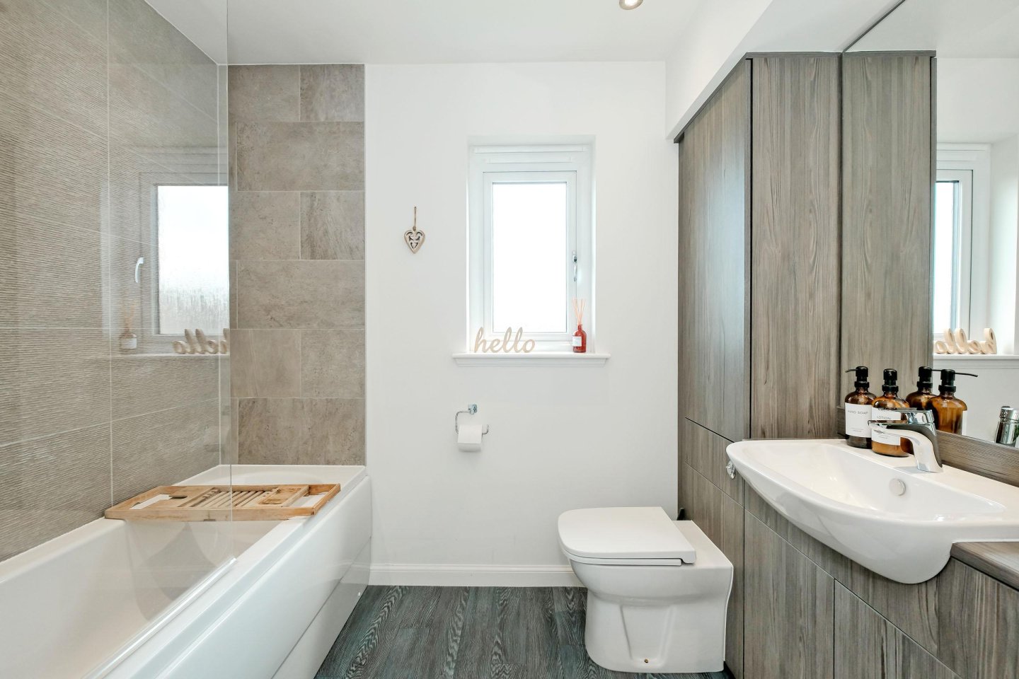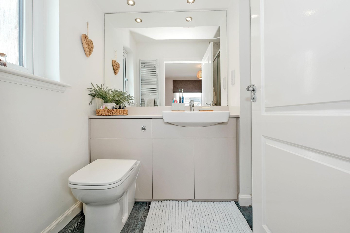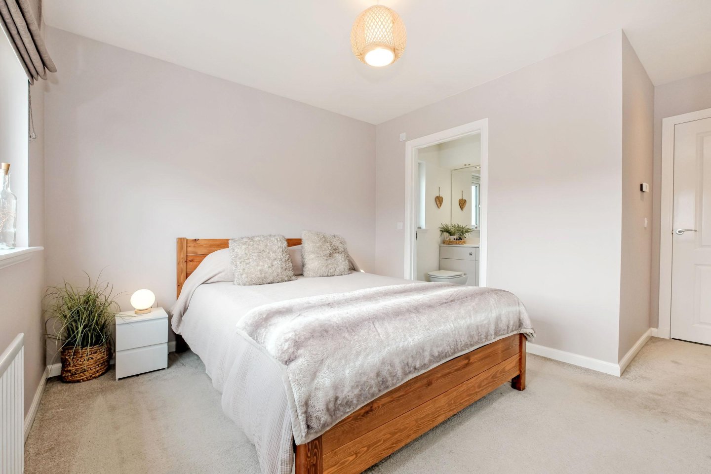On entering the property the large Lounge with window overlooking the front garden floods the room with natural light. The fully fitted Dining Kitchen is sure to be the heart of the home with sleek, High Gloss units with integrated appliances including gas hob, single oven, fridge/freezer, dishwasher and microwave. There is ample space for a dining table and chairs and the room also has a large cupboard and access to the Utility Room with washing machine and tumble dryer (both to remain) and a handy Cloakroom. French doors in the Kitchen lead to the fully enclosed south-facing Rear Garden with decked area, area with bark chippings, an ideal play-area and lawn. A side access gate leads to the front of the property. Upstairs, the Master Bedroom with built-in wardrobe with mirrored sliding doors provides considerable hanging and storage space is complemented with a luxurious En-Suite Shower Room with double sized shower cubicle and 2 piece white suite , the Guest Bedroom also benefits from built-in wardrobes, an additional cupboard and its own En-Suite Shower Room. Two further Double Bedrooms both with windows overlooking the rear garden, one of which is currently used as a Home Office, and Family Bathroom with 3 piece white suite with overbath shower completes the accommodation in this ready-to-move into dwellinghouse. All room sizes are generous and the property benefits from extensive storage with fitted wardrobes the Master Bedroom and also in the Guest Bedroom and large cupboards in the Kitchen and Upper Hallway.