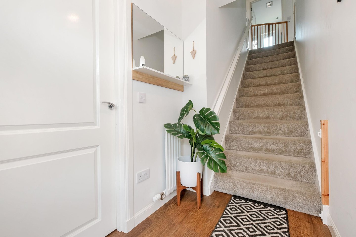 The front garden has a small area of garden with flower boxes, driveway for 2 cars, electric charging point and leads to the single garage which houses the central heating boiler.