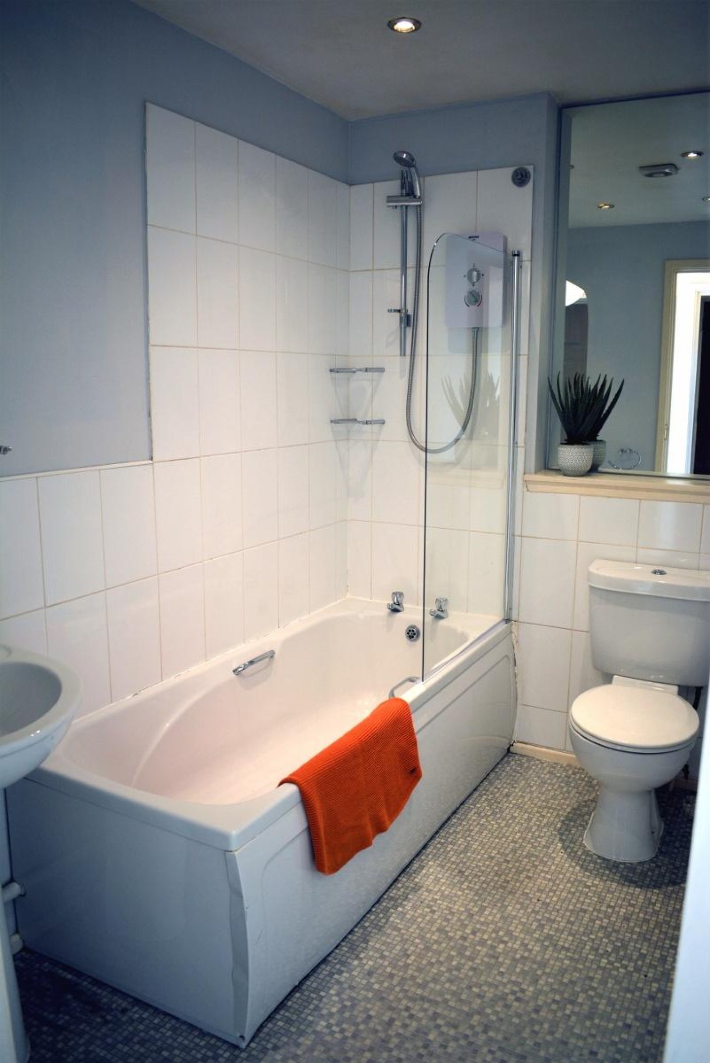 Bathroom: A three-piece white suite comprising pedestal style WC and wash hand basin. Bath with wall fitted shower with glass screen. Fully tiled in shower area to ceiling height. Vinyl floor covering. Electric panel heater. Recessed down lighters. Shaver point. Xpelair fan. Fitted mirror to remain. The chrome fitments will remain.