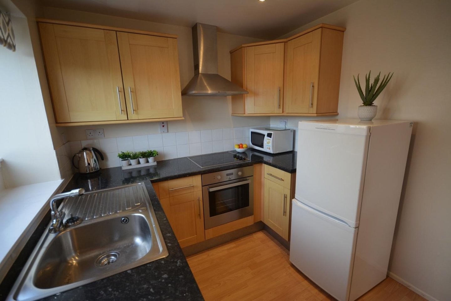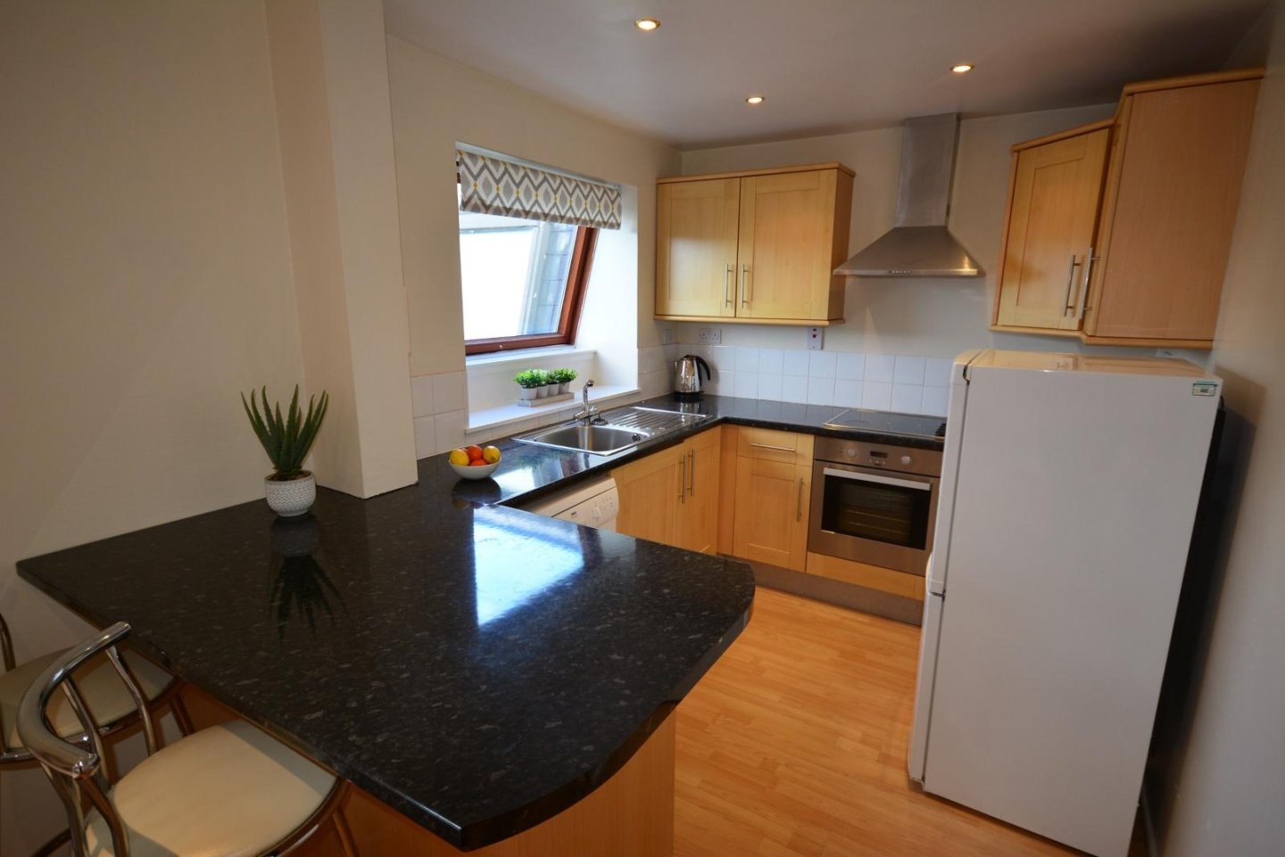 Kitchen: 3.15m x 2.59m (10'4" x 8'6") approx. Open plan with the Lounge, this is an extremely well fitted Kitchen with rigid carcass Howden units in Lyndhurst style with breakfast bar. Contrasting white tiles above worktops. Integrated oven and grill, four ring electric hob and extractor hood. Inset stainless steel sink with single drainer and mixer tap. Tilt and turn window with roller blind. Laminate flooring. Four recessed down lighters. Digital boost timer for hot water system. Two double and one single power points in addition to the those for the appliances. Included in the price are all the electrical goods in the kitchen which are washing machine, full size dishwasher, large free standing fridge/freezer and microwave.