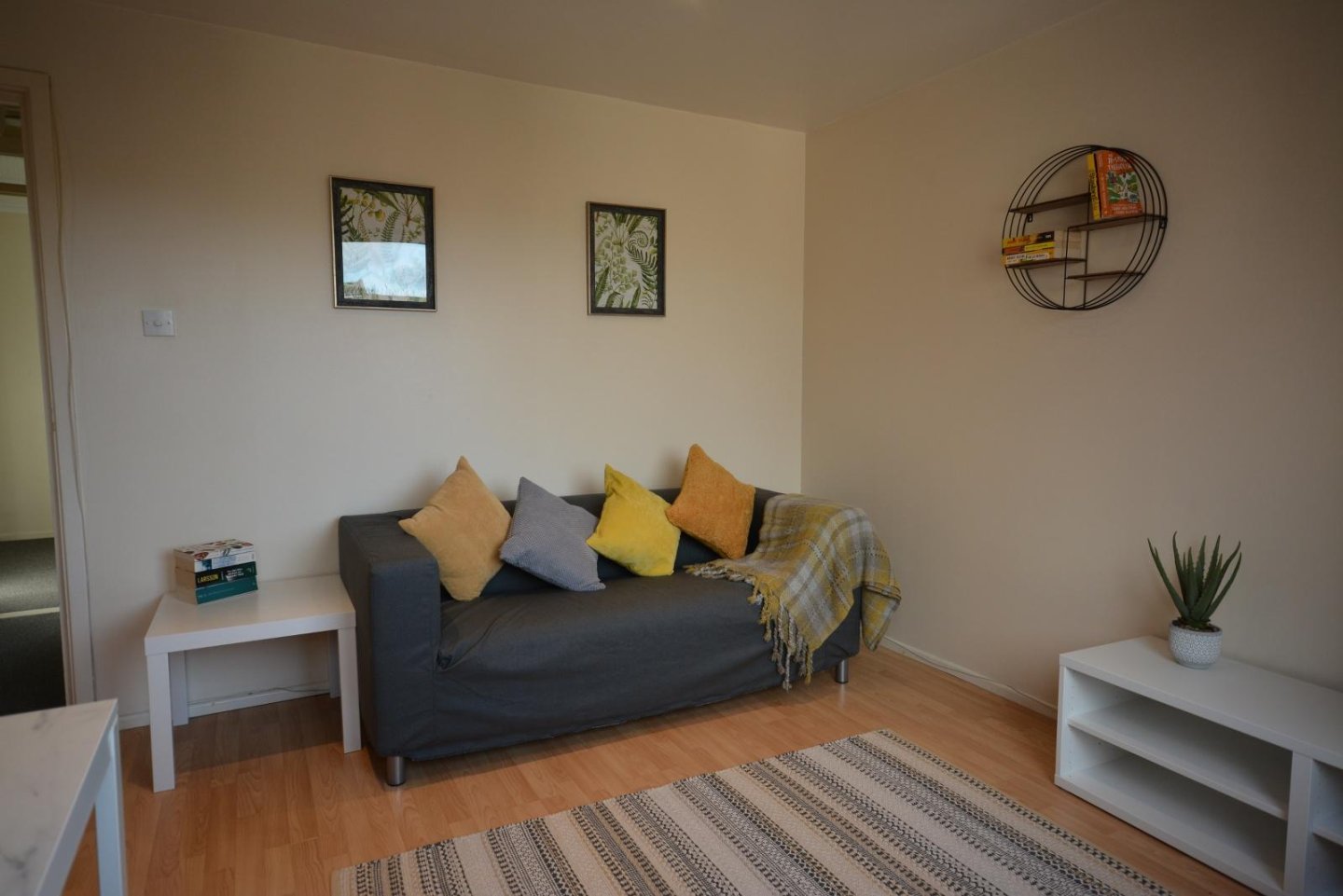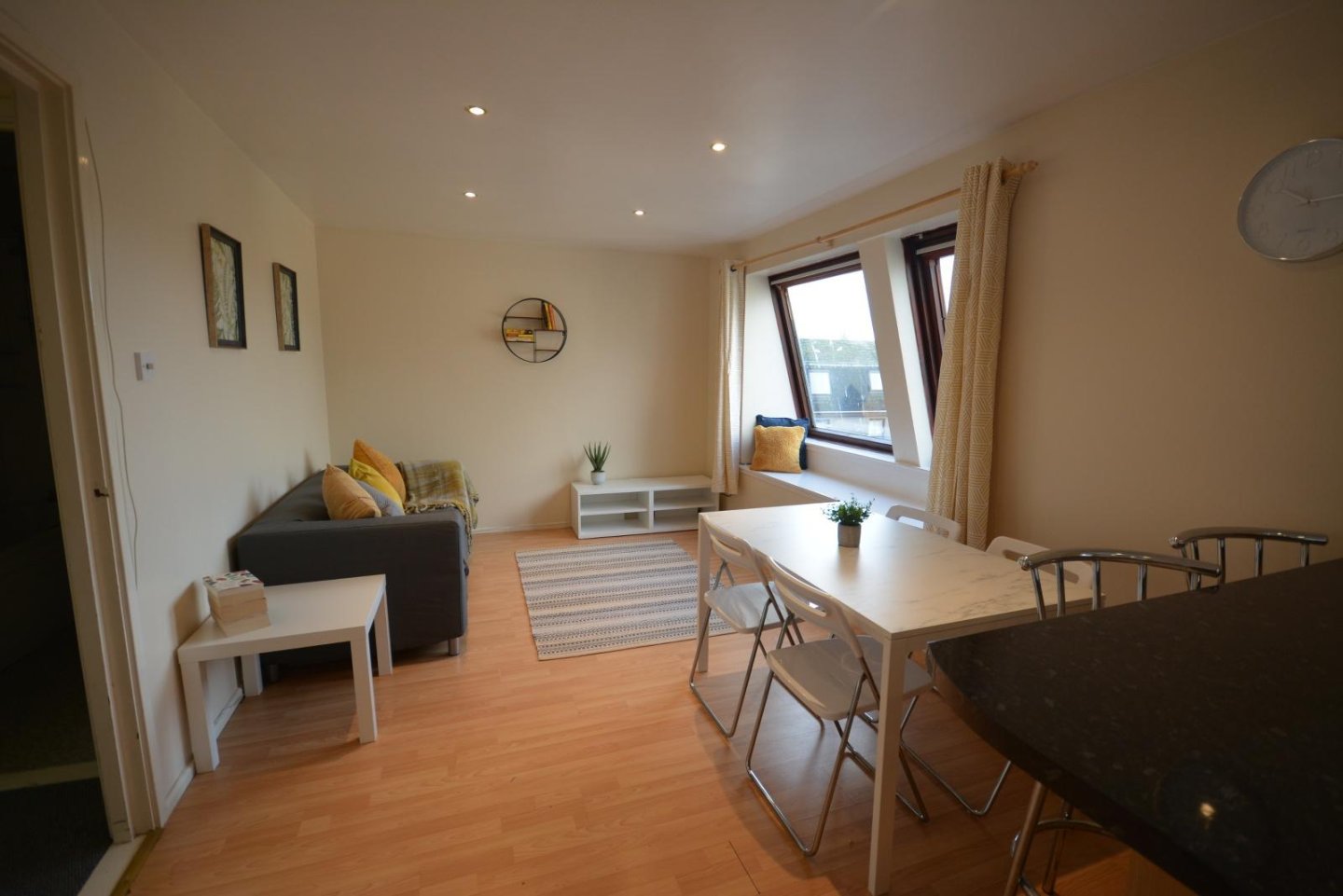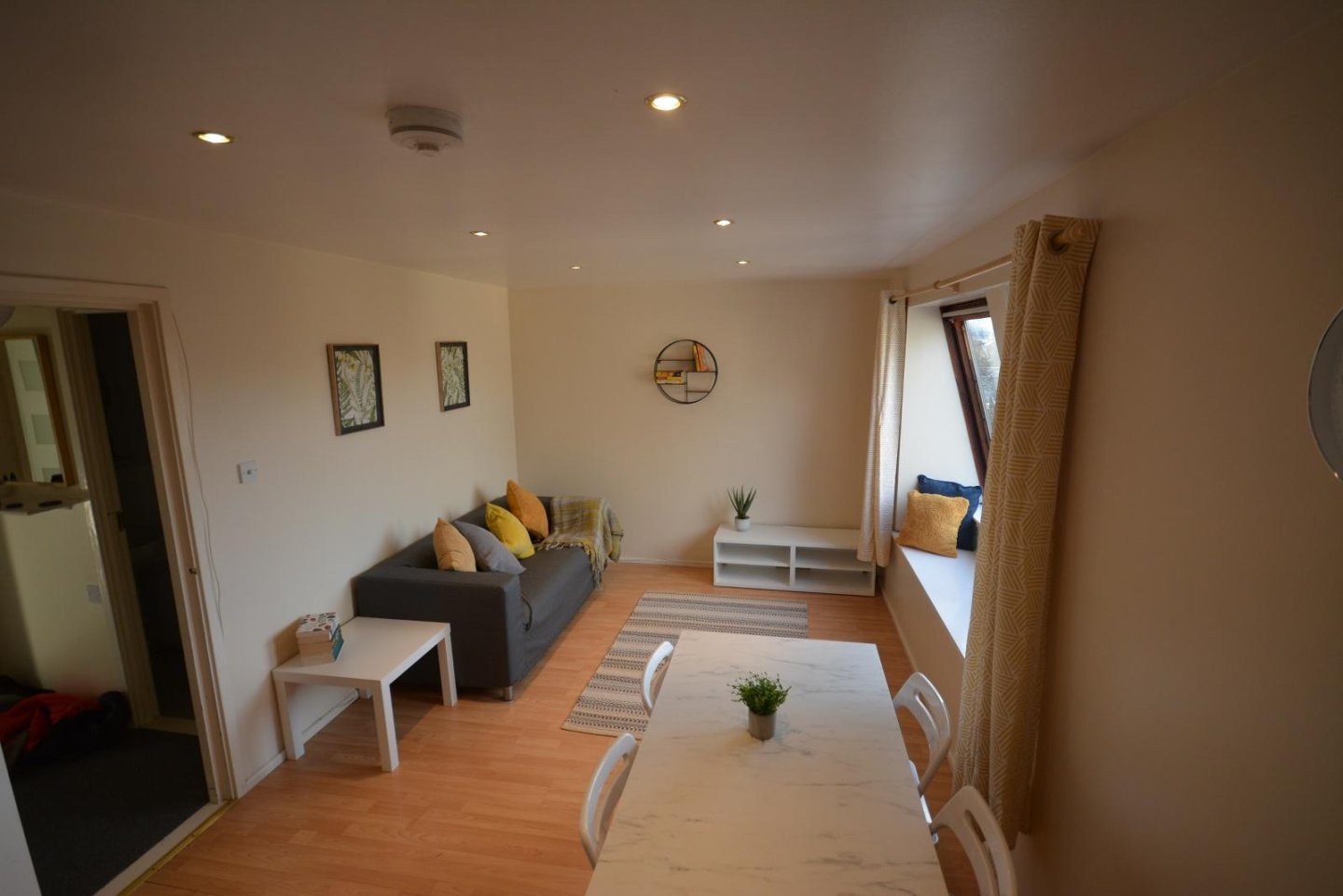 Lounge: 4.87m x 3.65m (16' x 12') approx. This is a bright spacious room with two tilt and turn windows with curtains. Laminate flooring. Electric panel heater. Six recessed down lighters operated by a dimmer switch. One single and one double power points. TV point. Telephone socket.