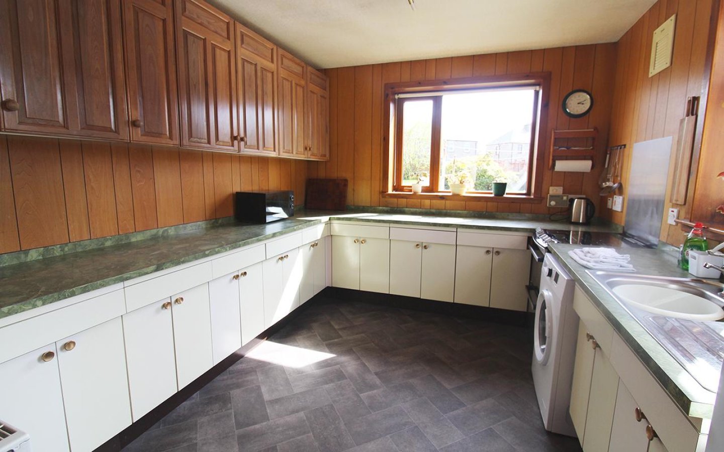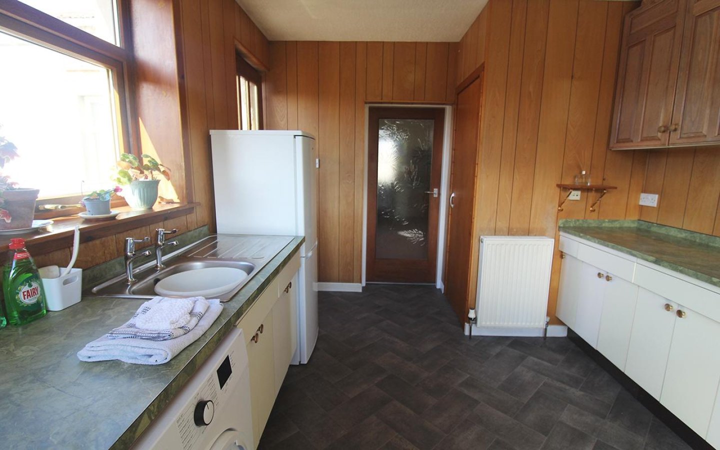 The dining room has a window to the side overlooking the rear garden and opens via a glazed door into the kitchen. The kitchen is fitted with a selection of base and wall mounted units with contrasting worktop, and upstands. The appliances which will remain include a slot in gas oven, fridge, freezer and washing machine. A stainless steel sink with drainer sits under one of the windows which both overlooks the large rear garden. Within the kitchen is a large pantry cupboard. A glazed uPVC door opens out to the rear garden.