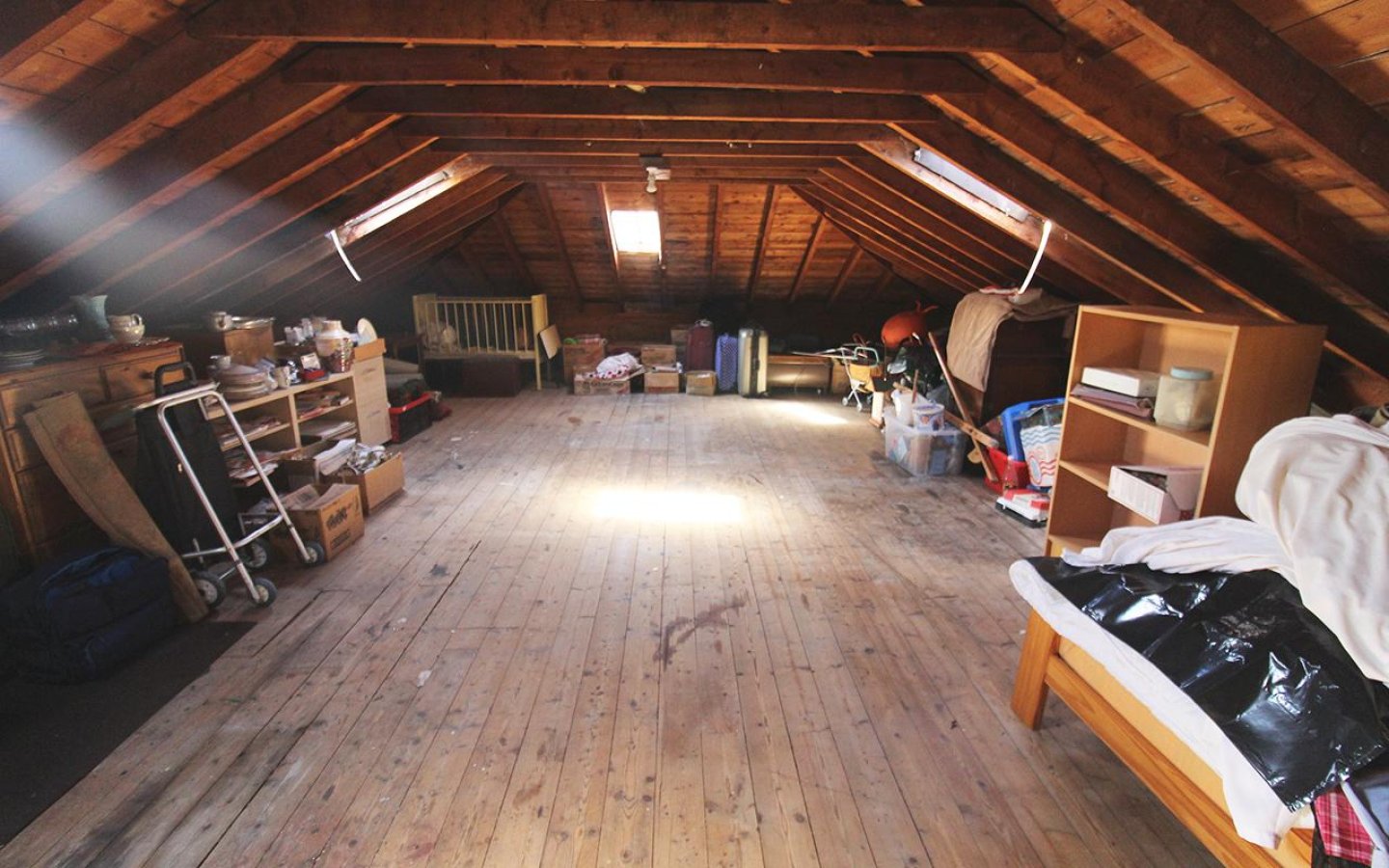 A shared external staircase leads up to the large loft storage room which is floor and has power and light.