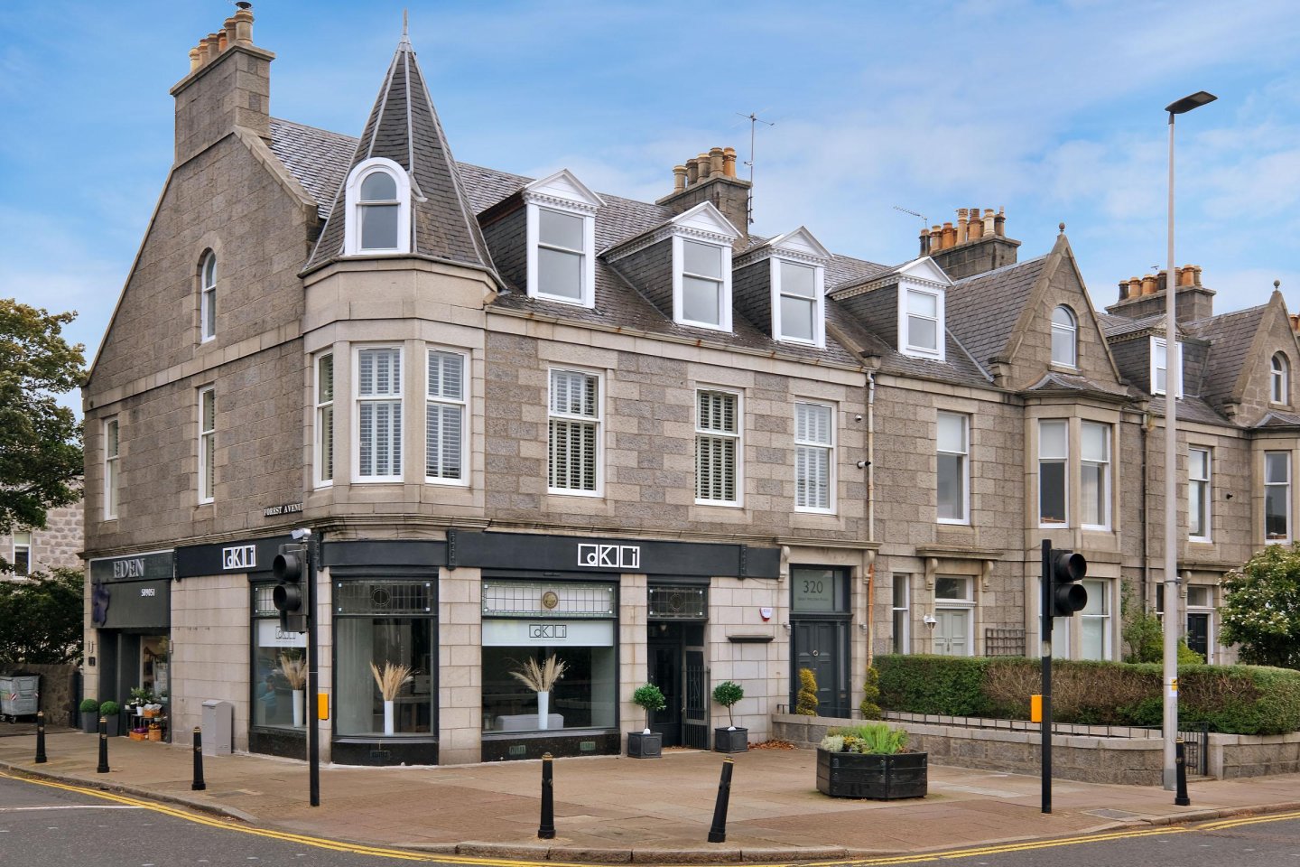 Travelling west on Union Street exit left into Holburn Street. Continue to the traffic lights and turn right into Great Western Road. Number 320 is located some way along on the right hand side at the junction with Forest Avenue.
