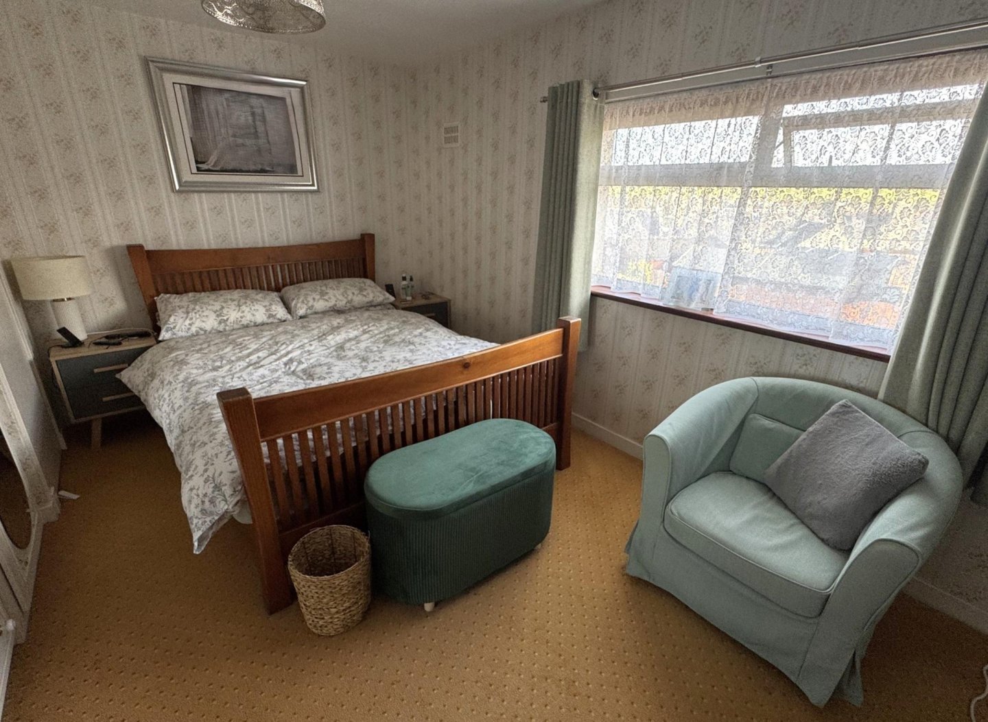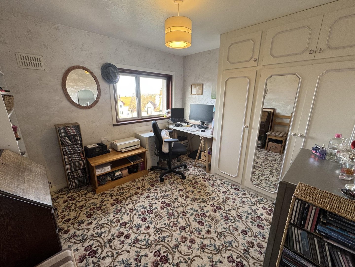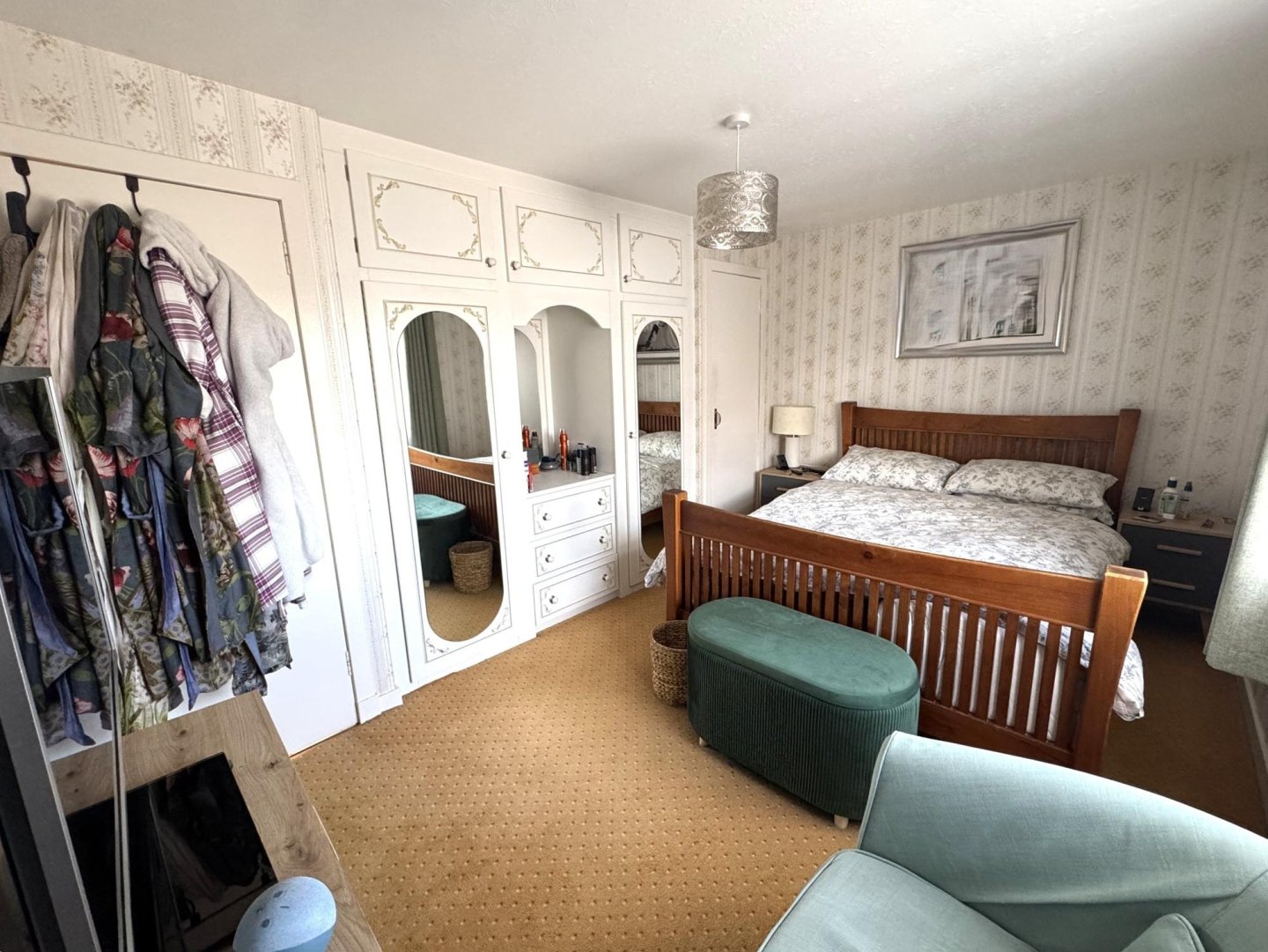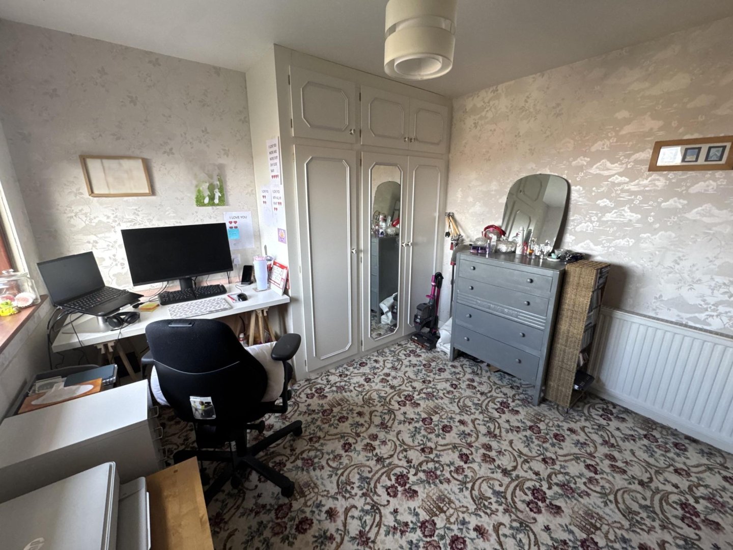 A front facing window overlooks the front garden and driveway/off-street parking. A large built-in wardrobe with shelving, rails and alcove with 3 drawers, provides additional storage. A built in cupboard houses the hot water tank and a smaller built in wardrobe provides additional storage.