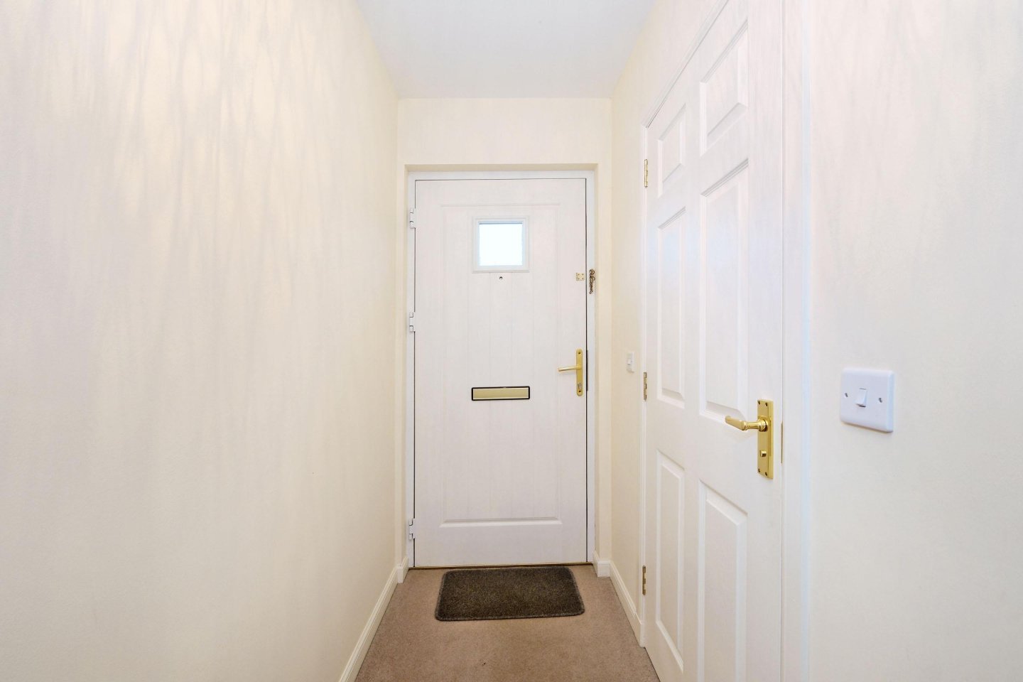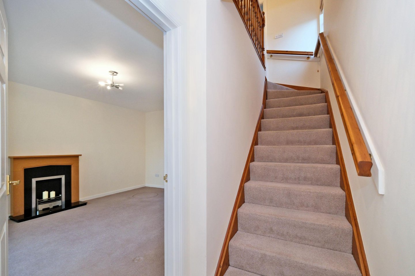 Entrance hallway: Exterior door with glazed panel, security chain and spyhole. Fitted carpet (matching Lounge, stairs and bedrooms). Radiator.. Ceiling light. Doors to Cloakroom and Lounge.
