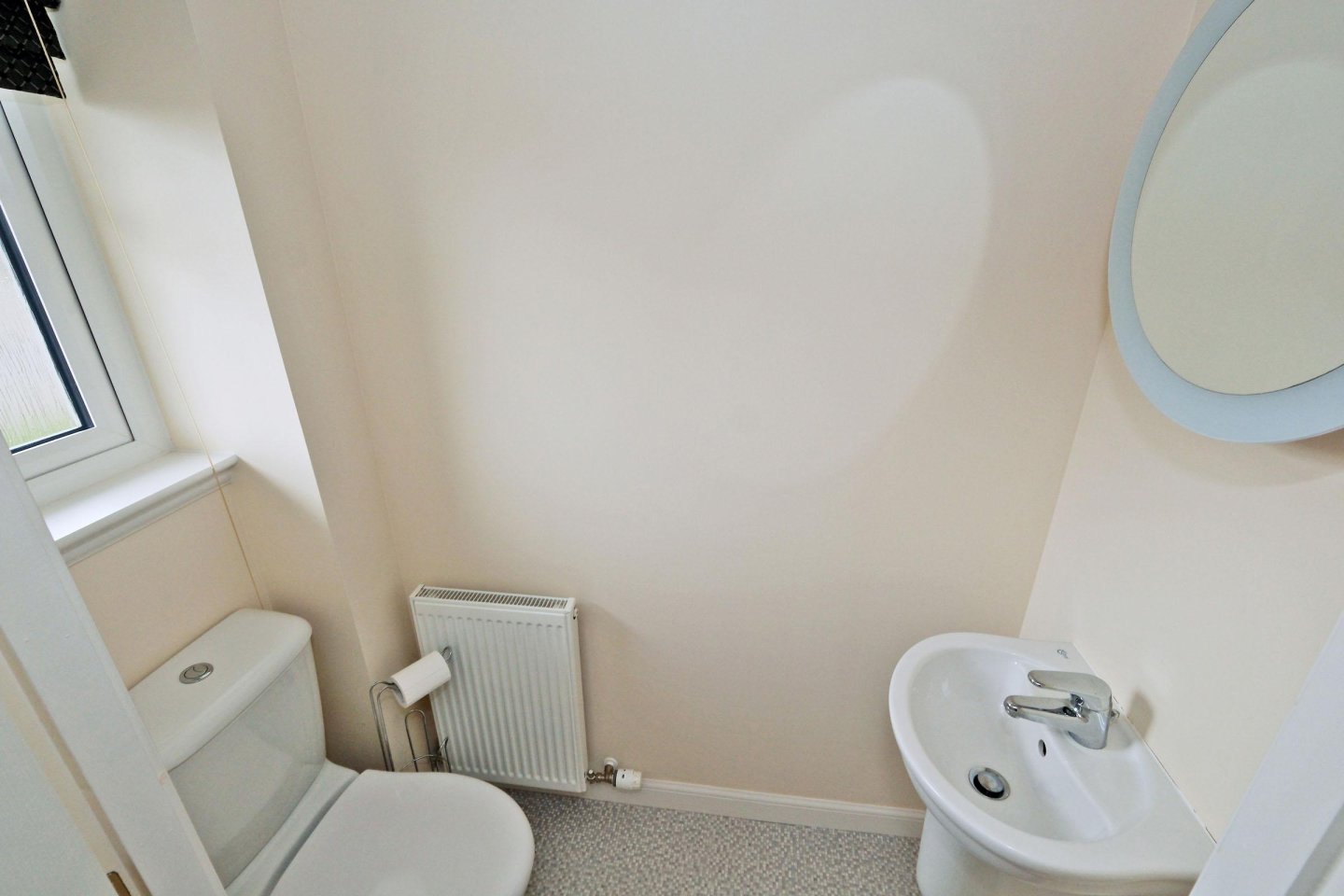 Cloakroom: With opaque window and Roman Bind. White two-piece suite with WC and wash hand basin. Vinyl flooring. Radiator. Ceiling light.