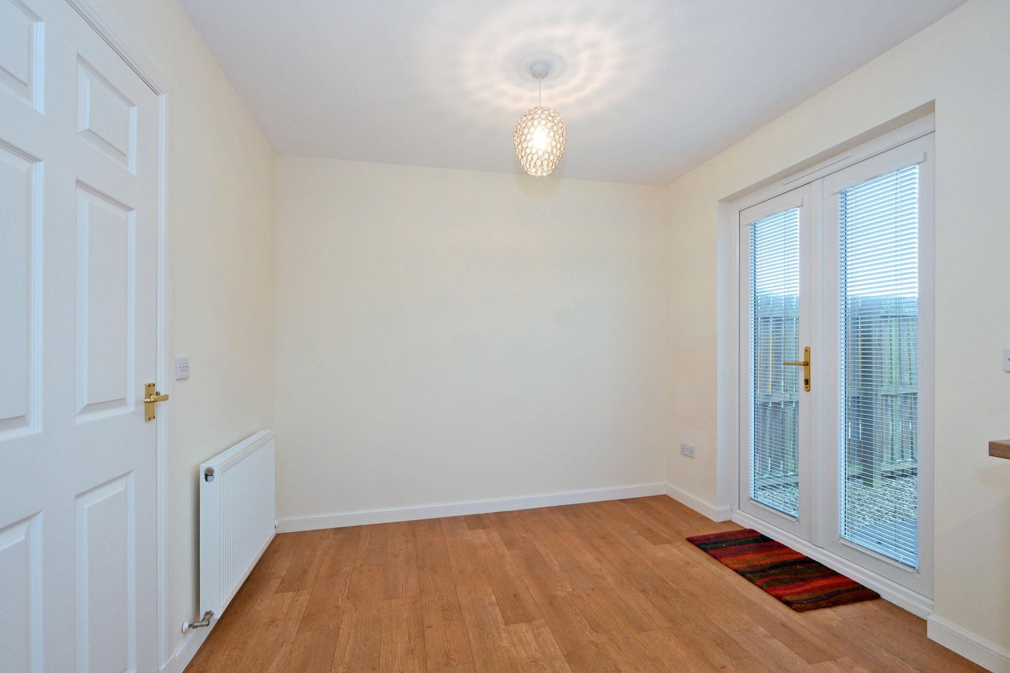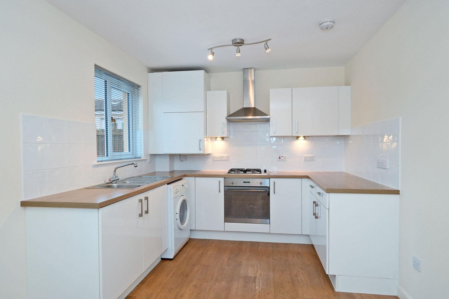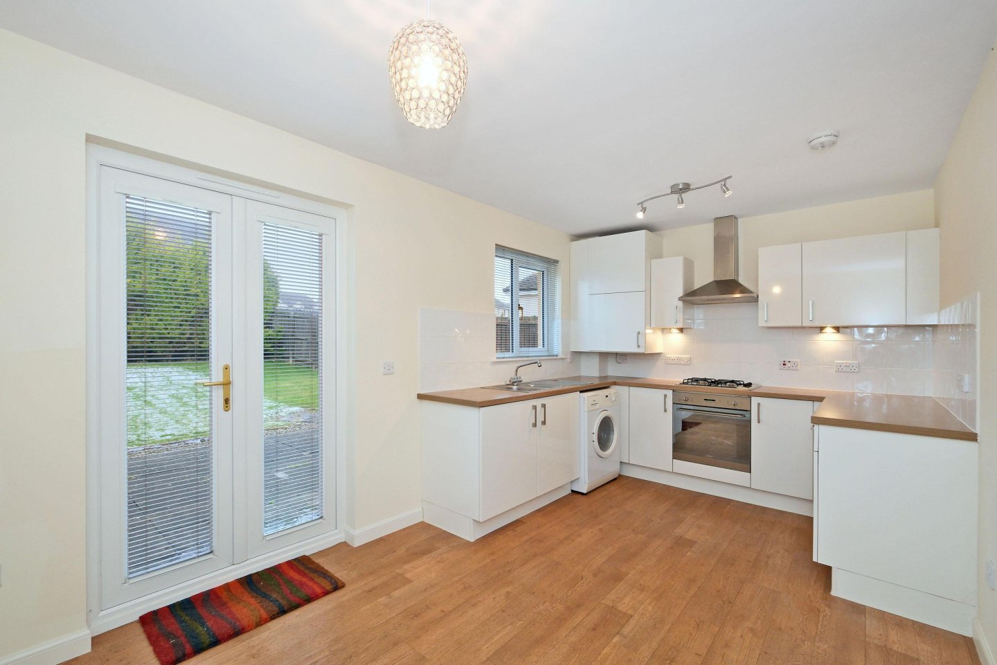 Dining kitchen: 4.64m x 2.81m (15’3" x 9’3") approx. Fitted with a range of modern High Gloss base and wall mounted storage units with worktops and chrome handles. Tiled splashback. Apell gas hob with single oven below and stainless steel extractor hood above. Smeg washing machine. Worcester central heating boiler concealed in wall unit. Ample power points. 1 ½ bowl stainless steel sink and drainer with mixer tap. Window overlooking the rear garden with venetian blind. Spotlight track with 3 lights over kitchen area. Space for fridge/freezer. Ample space for dining table and chairs with French Doors with venetian blinds lead to the Rear Garden. Radiator. Ceiling light. Vinyl flooring.