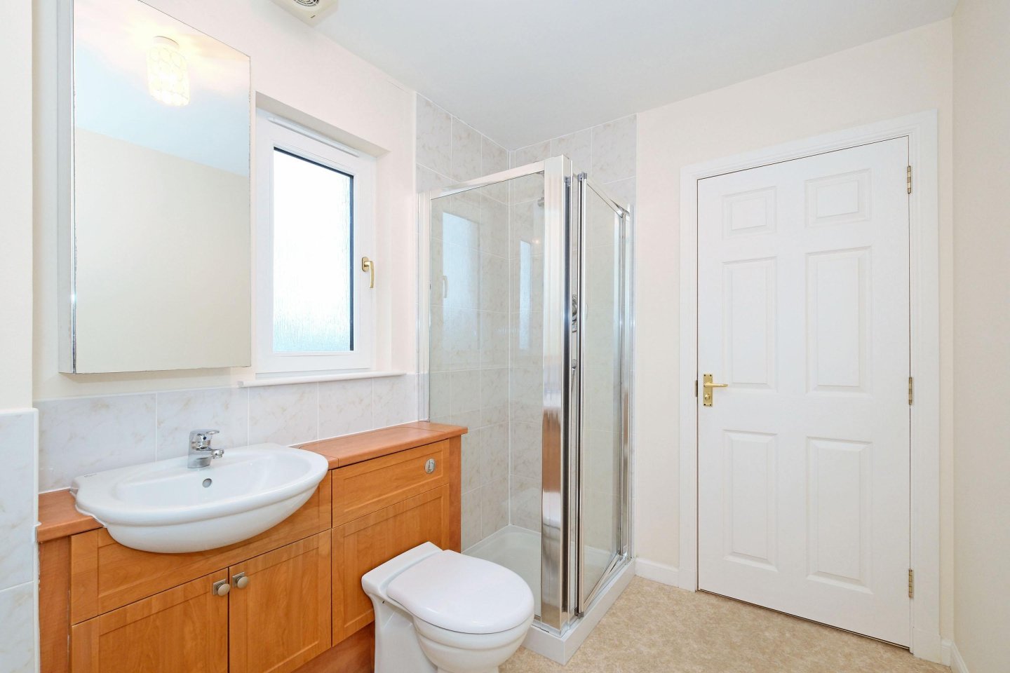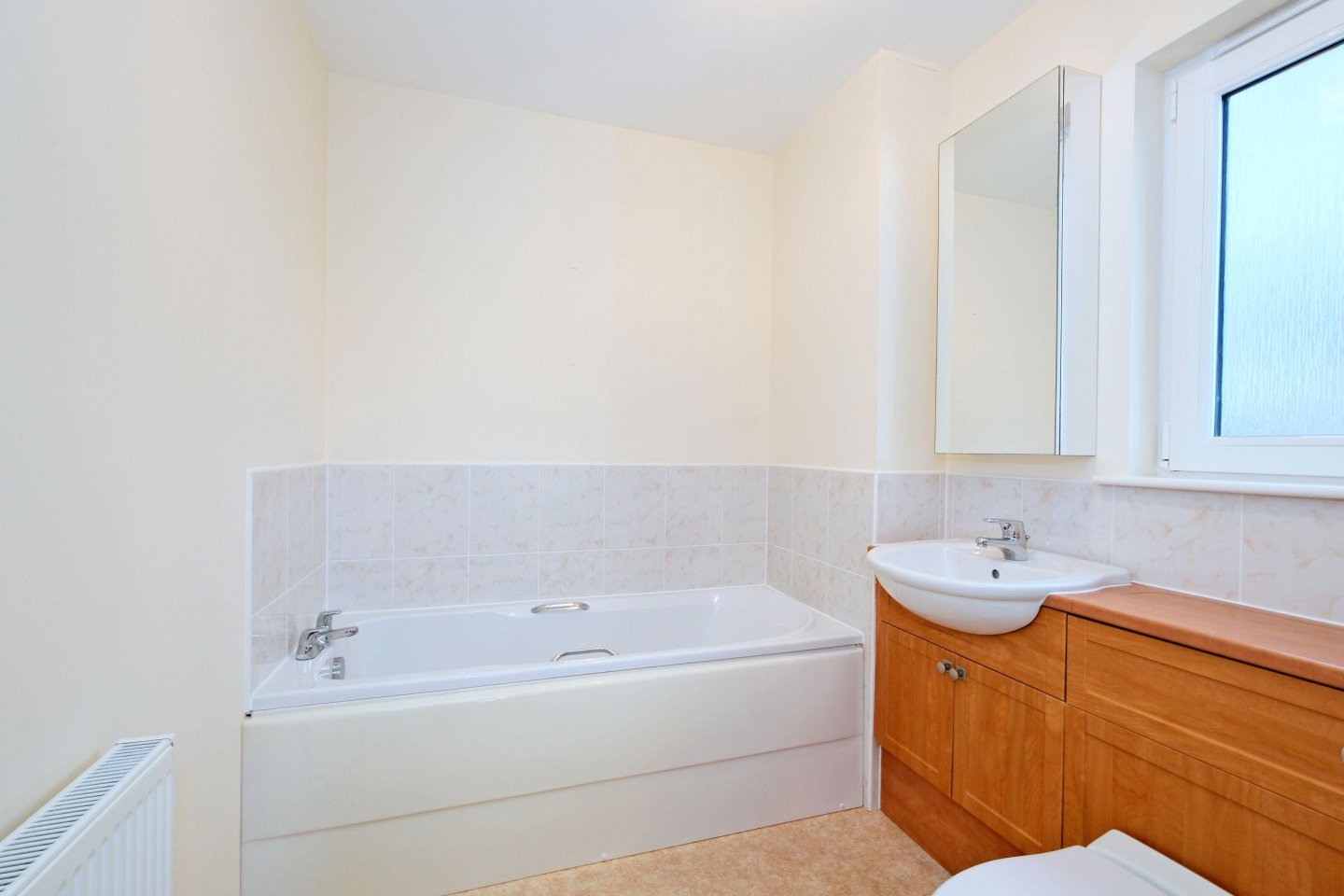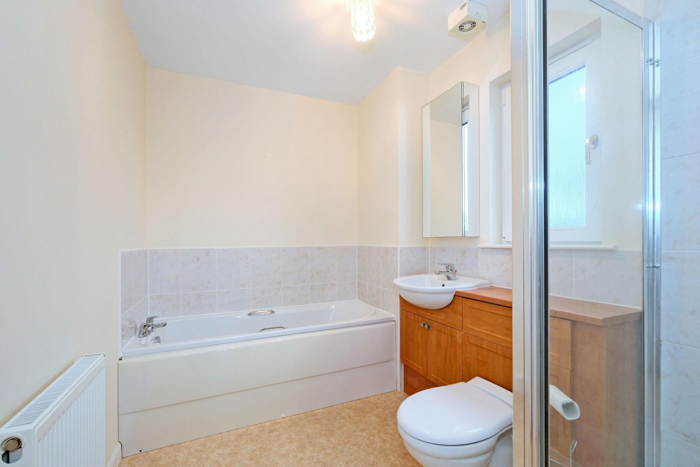 Family bathroom: 2.84m x 2.03m (9’4" x 6’8" approx. With opaque window to the side of the property. This spacious family bathroom fitted with 3 piece suite and separate, fully tiled, shower enclosure. WC and wash-hand basin with storage underneath. Radiator. Vinyl flooring. Extractor fan. Ceiling light.