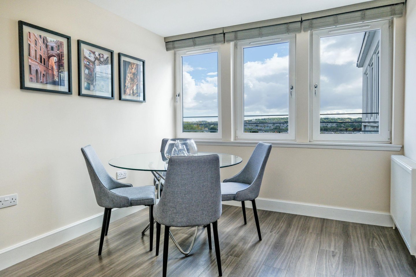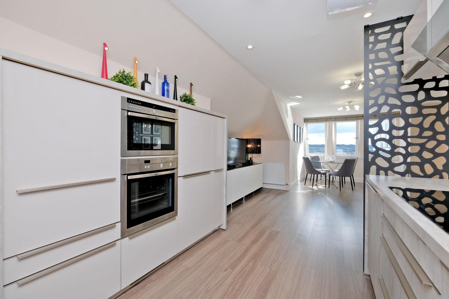 Lounge/Dining Area: 5.68m x 4.69m (18’8" x 15’5") approx. Three rear facing windows provide open southerly views over the City. Wooden venetian blinds. Part glazed oak door to Hallway. Ample space for dining table and chairs. Twin ceiling lights. Twin radiators. Ample power points. TV aerial and telephone points.
