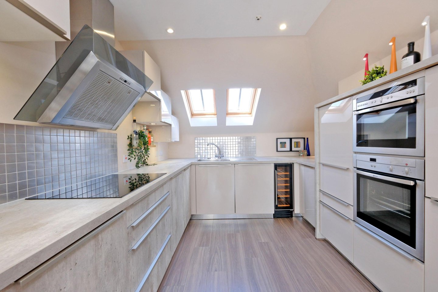 Kitchen: 3.60m x 3.14m (11’10 x 10’4) approx. The kitchen is fitted with a range of quality base and wall mounted units with co-ordinating worktops. Two velux windows provide natural light. Franke 1½ bowl sink and drainer with mixer tap. Neff induction hob with extractor hood above. Integrated Neff microwave and oven. Integrated Neff fridge, freezer and dishwasher. Neff washer dryer. Baumatic wine cooler. Central heating boiler concealed in wall mounted unit. Central heating thermostat. Ceiling downlighters with complimentary unit lighting and wall lights. Ample power points. Extractor fan.
