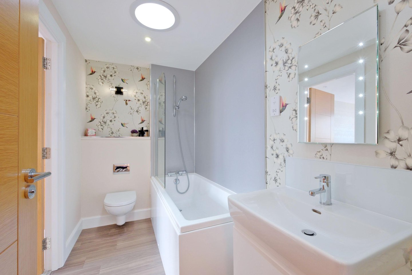 Bathroom: 2.81m x 1.57m (9’3" x 5’2") approx. Centrally located and fitted with a white 3 piece Laufman suite. Shower attachment over bath with full aqua panelling and shower screen. Concealed cistern. Wash-hand basin recessed in vanity unit with storage drawer. Vanity wall mirror with integral lighting. Shaver point. Extractor fan. Ceiling lights. Wall light. Ladder style heated towel rail. Sun pipe providing natural light. Doors to Hallway and Double Bedroom 2.