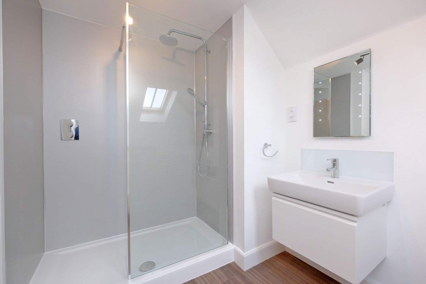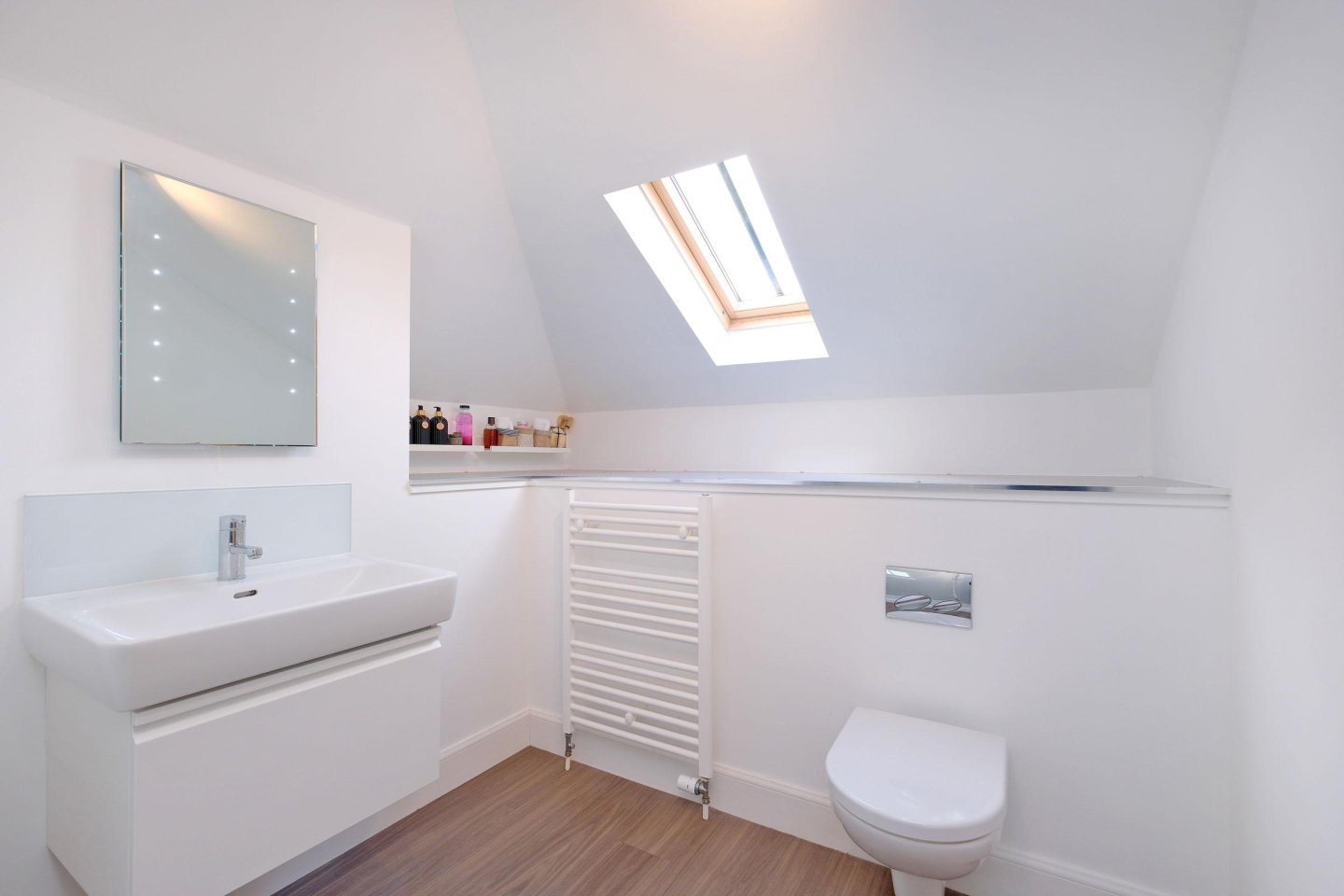 En-Suite Shower Room: 2.74m x 1.82m (9’ x 6’) approx. Large aqua-panelled walk-in shower enclosure with dual-head shower. White Laufman wash-hand basin and WC. Concealed cistern. Wash-hand basin recessed in vanity unit with storage drawer. Amtico flooring. Velux roof light. Ladder style heated towel rail. Shaver point. Ceiling light. Extractor fan. Vanity mirror with integral lighting. Usual fitments.