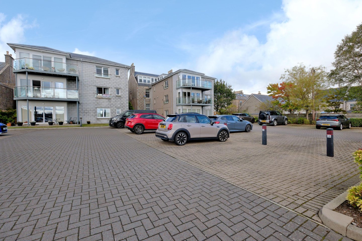 The Apartment Block sits in mature landscaped grounds. Two allocated car parking spaces in car park adjacent to front door of Apartment Block. Ample visitor parking. Access pathway from the front leading to the rear car park. Attractive shared courtyard with drying area. Concealed bin store. Secure bike shed.