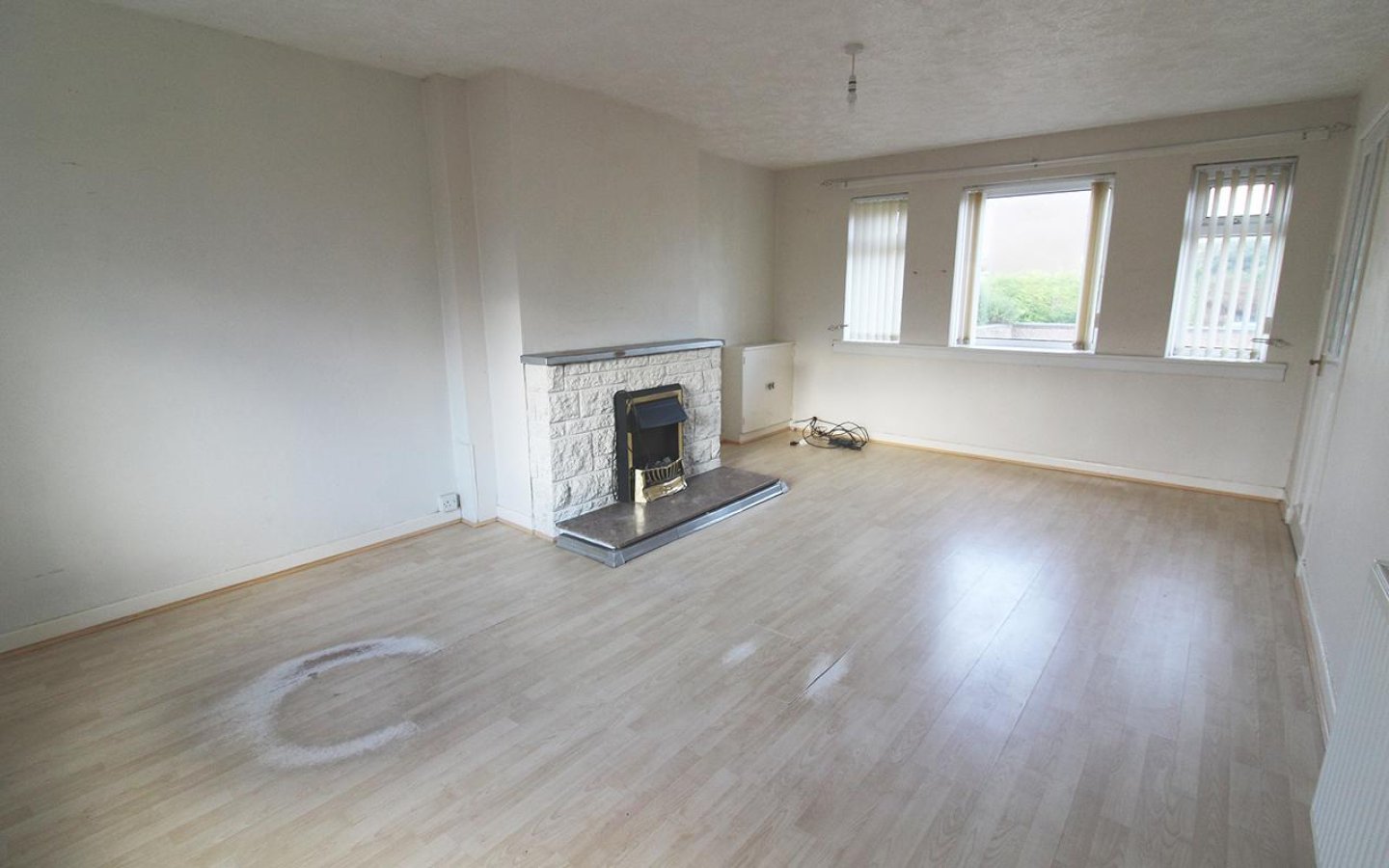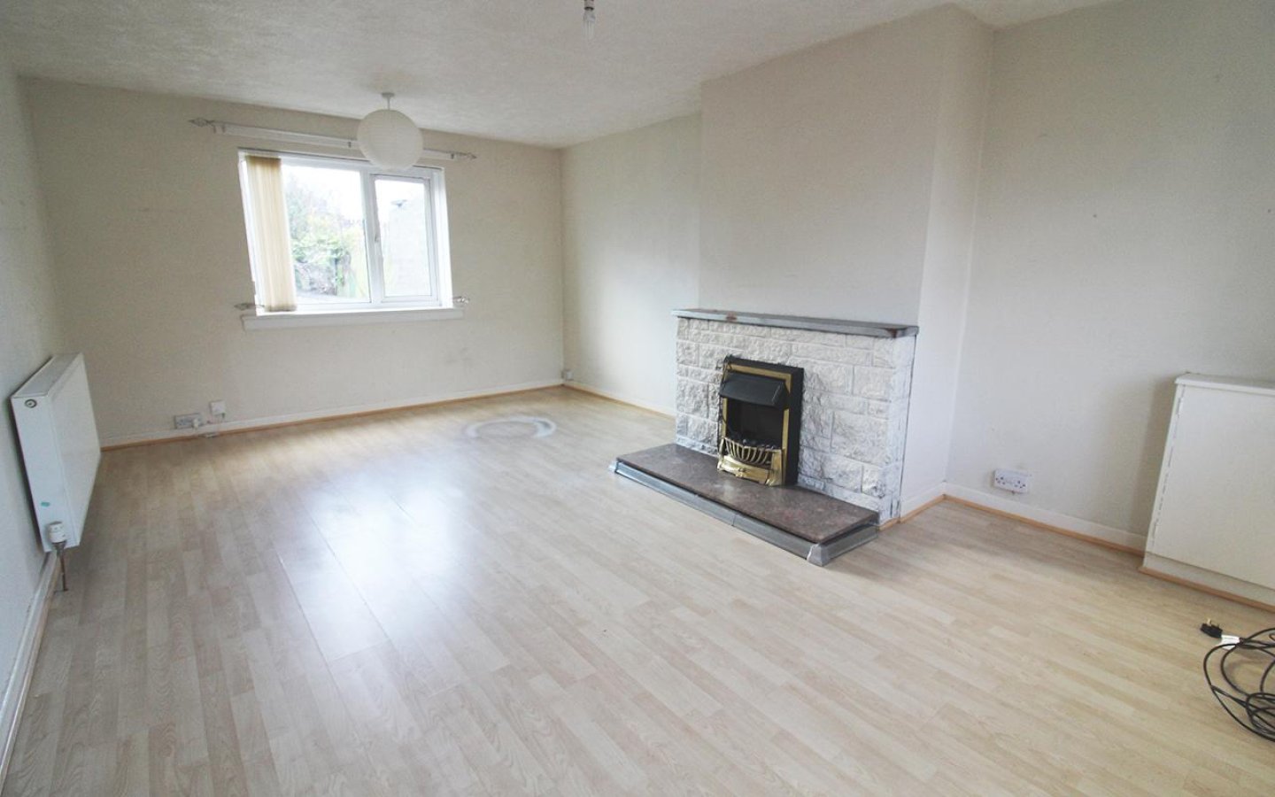 The living room is a bright room with windows overlooking both the front and rear garden. An electric fire sits within the stone fire surround which has a wooden mantle. The living room has laminate flooring and a cupboard houses the electric meter.
