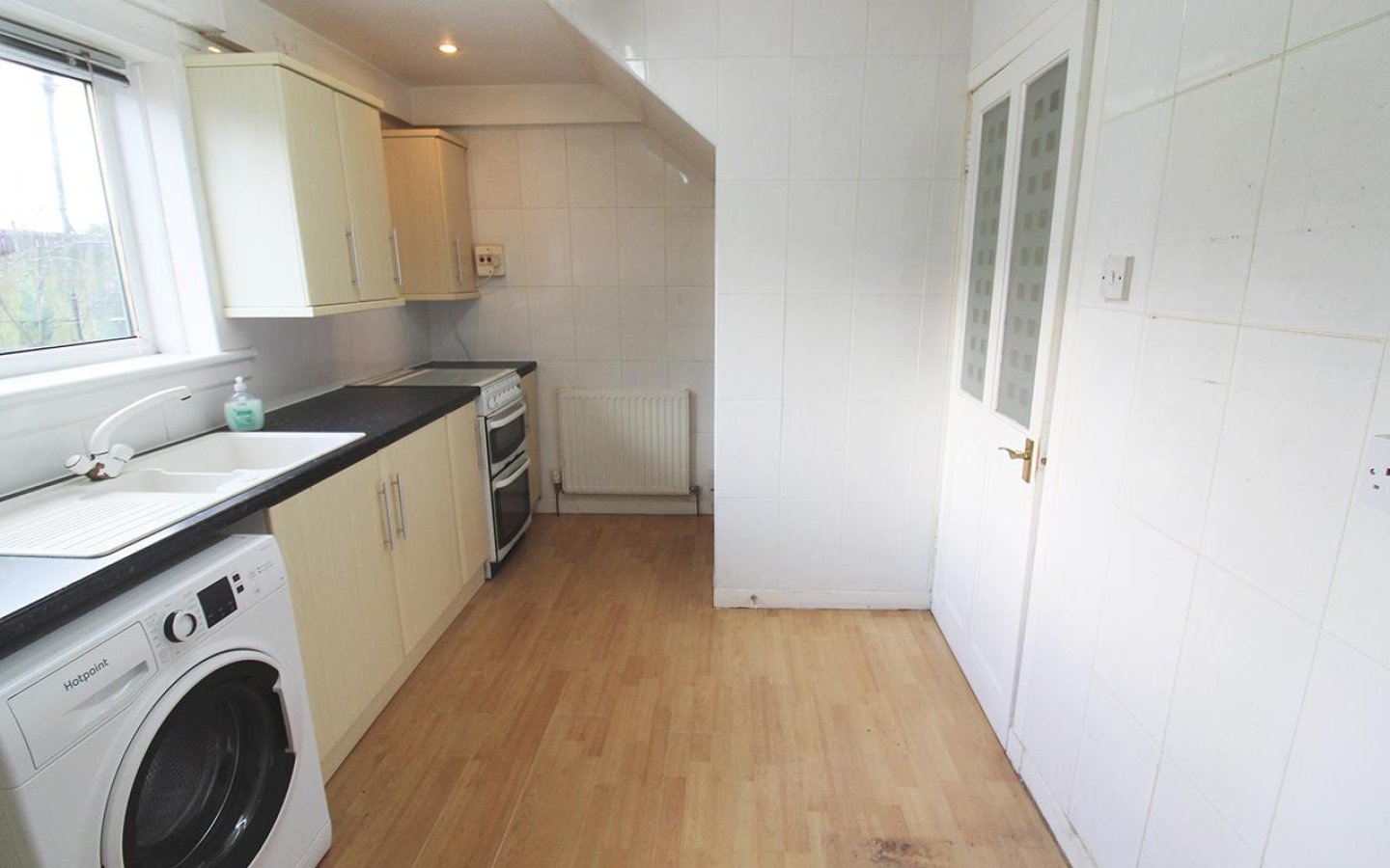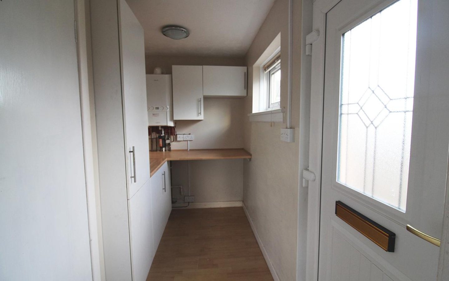 The kitchen is fitted with a range of base and wall units, complemented by a contrasting worktop. The slot-in gas cooker and washing machine are included in the sale. A 1 ½ sink with drainer and mixer tap sits below the window overlooking the large rear garden. An open under stair cupboard offers storage. The room is tiled, finished with laminate flooring, and a door leads to the utility. The utility also has base and wall mounted units offering additional storage with a wood effect worktop. Also within the utility is a large cupboard as well as the boiler. A uPVC exterior door opens to the side of the property onto the driveway.