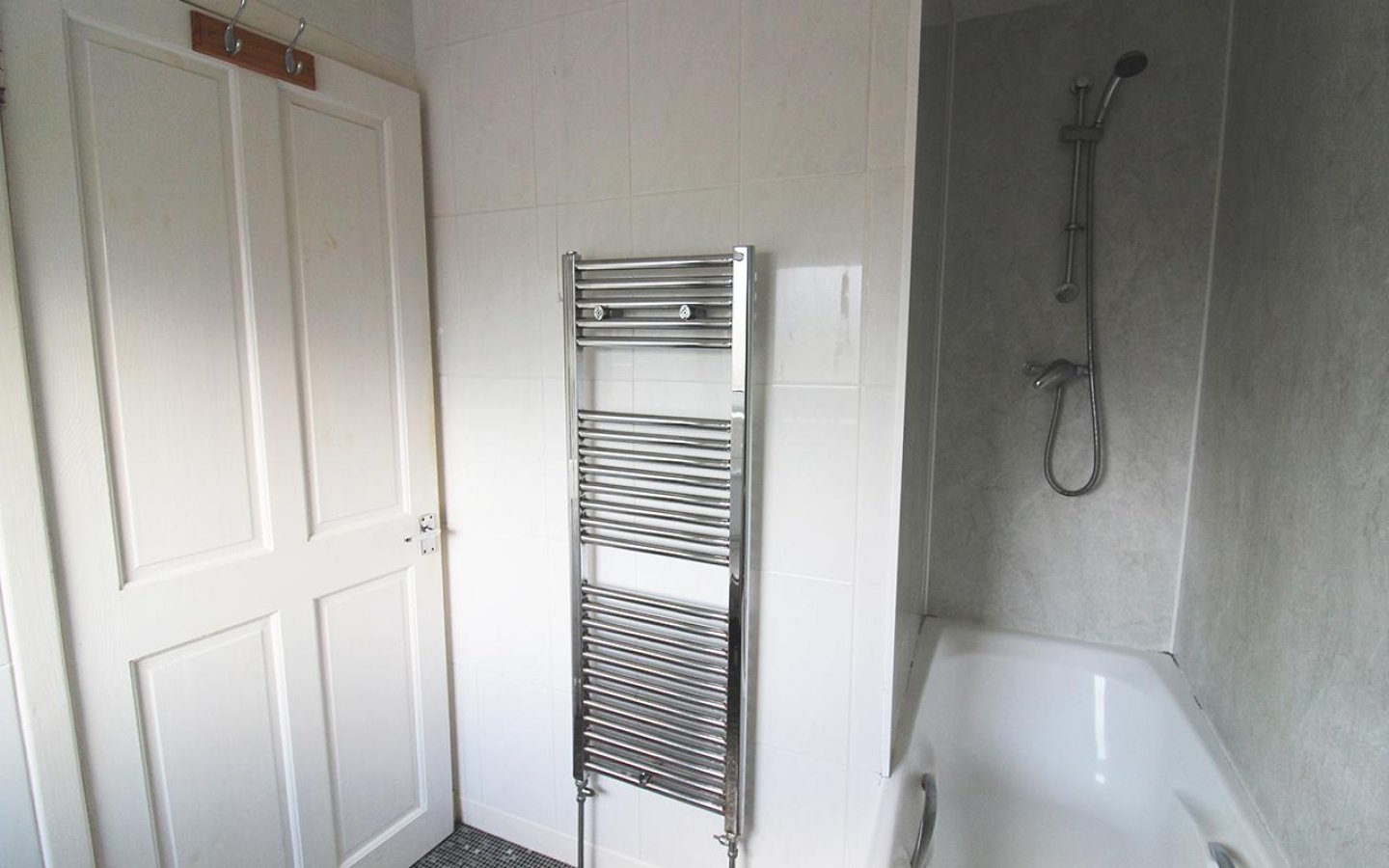 The bathroom is fitted with a white suite comprising WC, wash hand basin and bath with mains shower over. Aqua panelling is fitted around the bath and shower with tiling around the rest of the room. The bathroom is completed with a chrome towel radiator, vinyl flooring and has a frosted window to the rear.