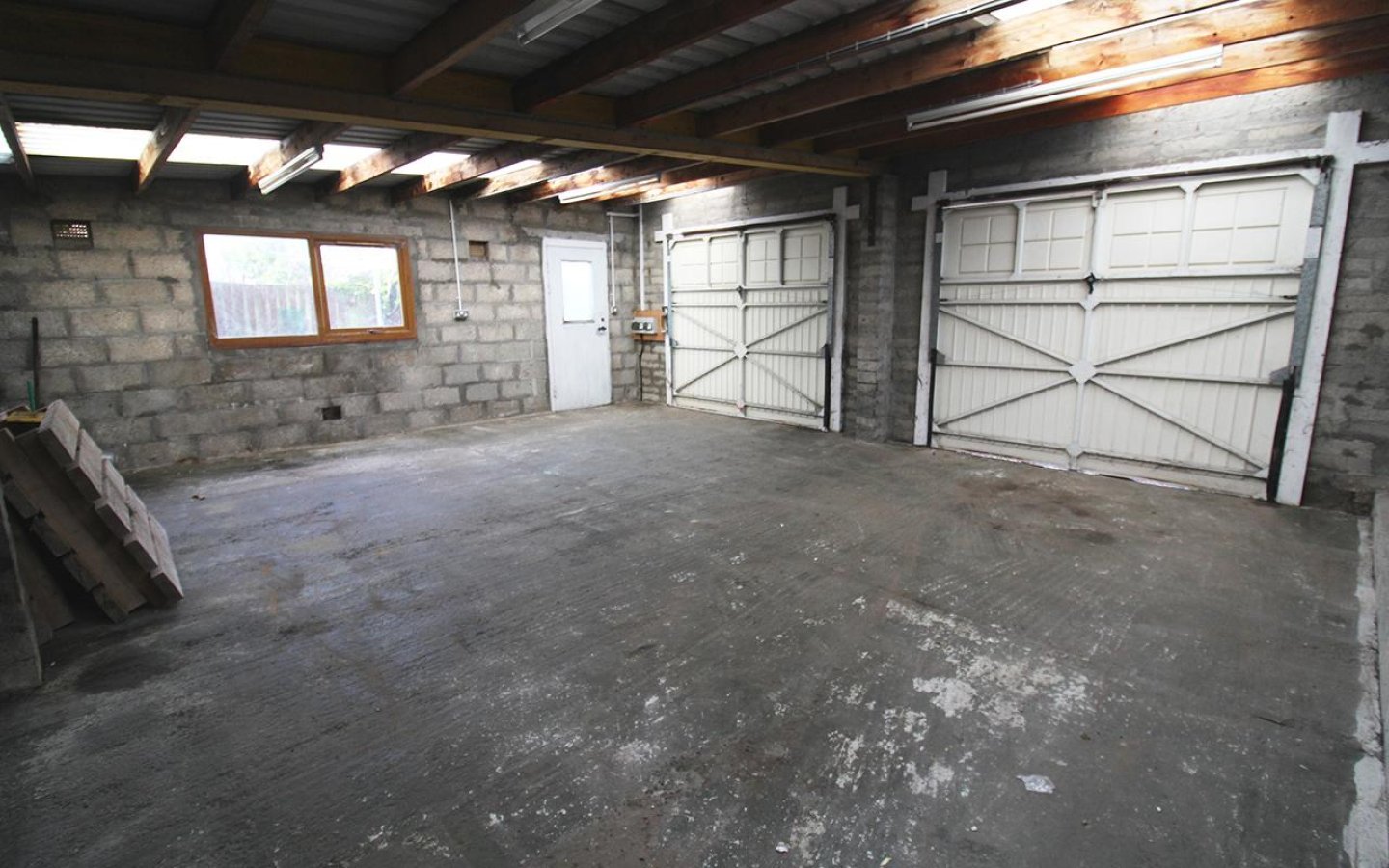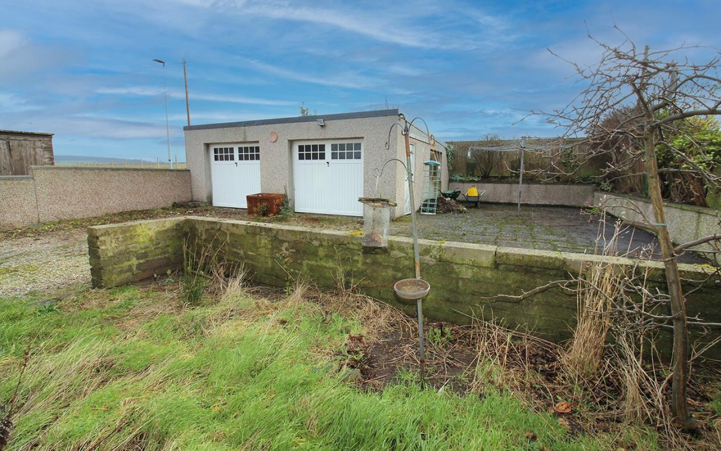 The home sits on a large plot with the front garden and driveway providing off-street parking for several vehicles. The large rear garden includes a patio, an area of lawn, an outside tap, and the large double garage. The garage has both power and light.
