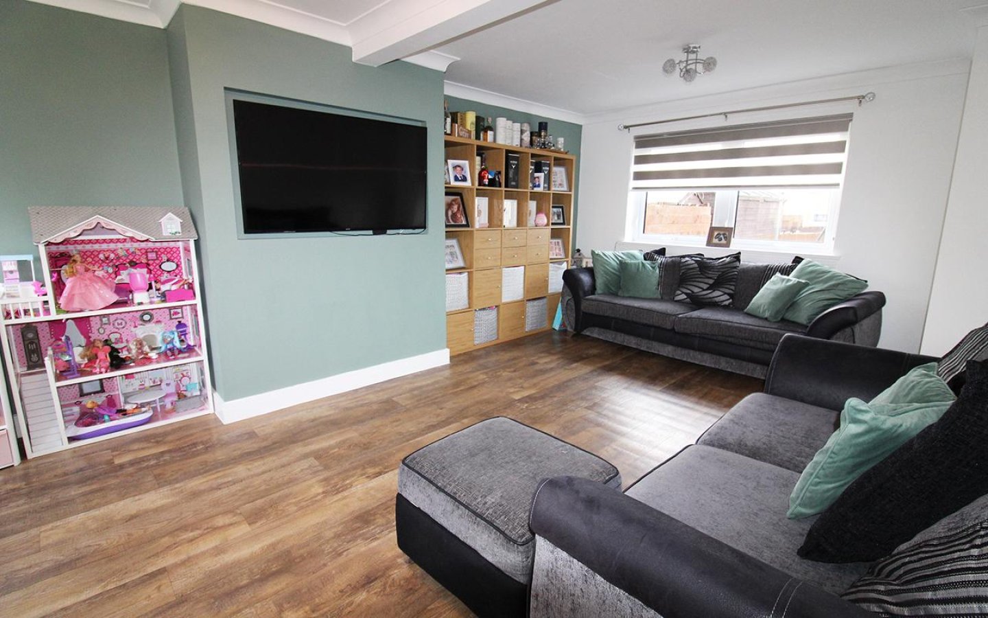 The property is accessed via a uPVC door with glazed side screen into the hall which accesses the living room and the carpeted staircase to the first floor. The wood effect laminate from the hall continues into the living room, which is a lovely bright room with windows to the front and rear. The living room is tastefully decorated with a feature wall adding a pop of colour. A door from the living room leads into the dining kitchen.