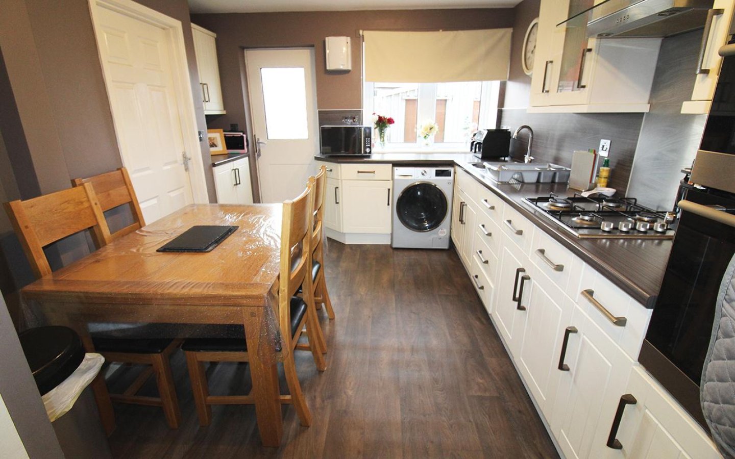 The dining kitchen is fitted with a good selection of base and wall mounted units with contrasting worktop and splashback. Integrated appliances consist of a double electric oven and gas hob with extractor above. There is space within the kitchen for a washing machine and fridge/freezer. 1 ½ stainless steel sink with drainer and mixer tap. There is ample space within the kitchen for a dining set. A large under stair cupboard provides additional storage. Glazed uPVC door opens into the rear garden. A utility area is accessed from the kitchen via a glazed door and houses the boiler, offers more storage, coat hooks and has a second uPVC door opening out to the front garden.