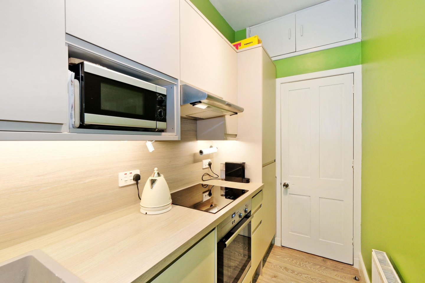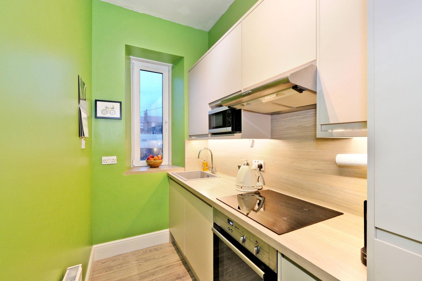 Kitchen: 2.87m x 1.42m (9’5" x 4’8") approx. Fitted with a range of modern base and wall mounted storage units with co-ordinating work surfaces and wall-boarding. Sink with mixer tap. Lamona induction hob with extractor hood above and electric oven below. Integrated washing machine. Integrated fridge/freezer. Microwave to remain. Window overlooking the rear garden. Grey granite effect laminate flooring. Ceiling light with complimentary unit lighting. Ample power points. Radiator. High level storage cupboard.