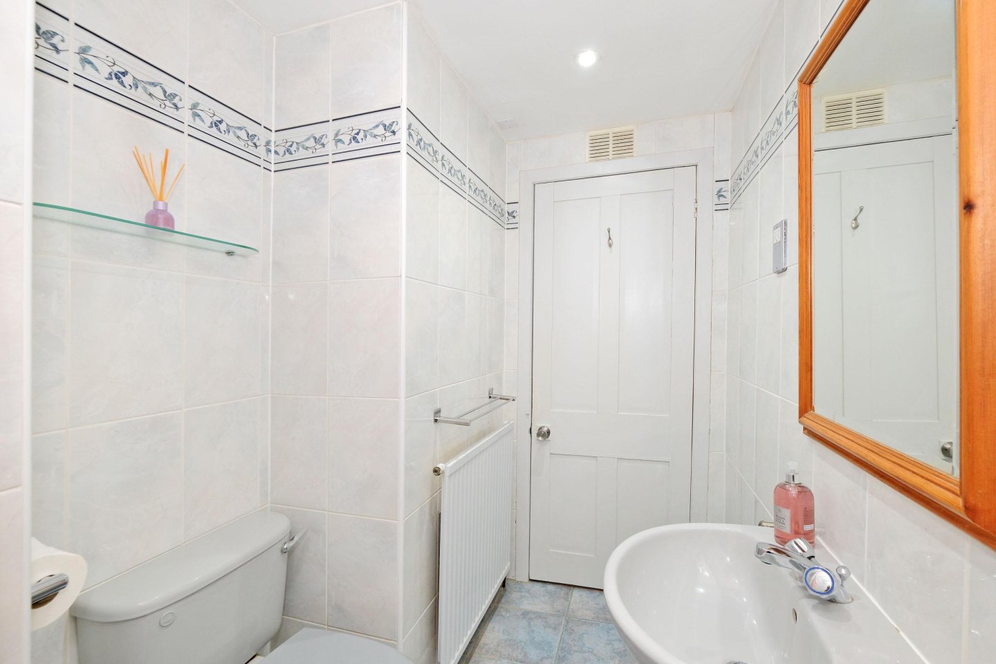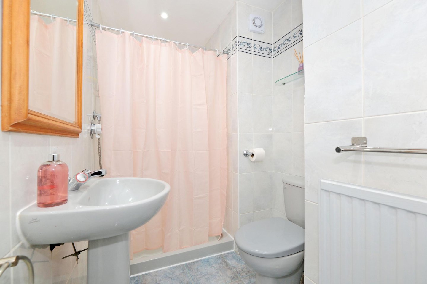 Shower Room: 2.74m x 4.52m (9’ x 5’) approx. Centrally located with Ideal Standard wc and wash-hand basin. Large shower enclosure with Aqualizer shower. Full ceramic wall tiling and co-ordinating floor tiling. Radiator. Ceiling downlighters. Extractor fan. Shaver point. Usual fitments.