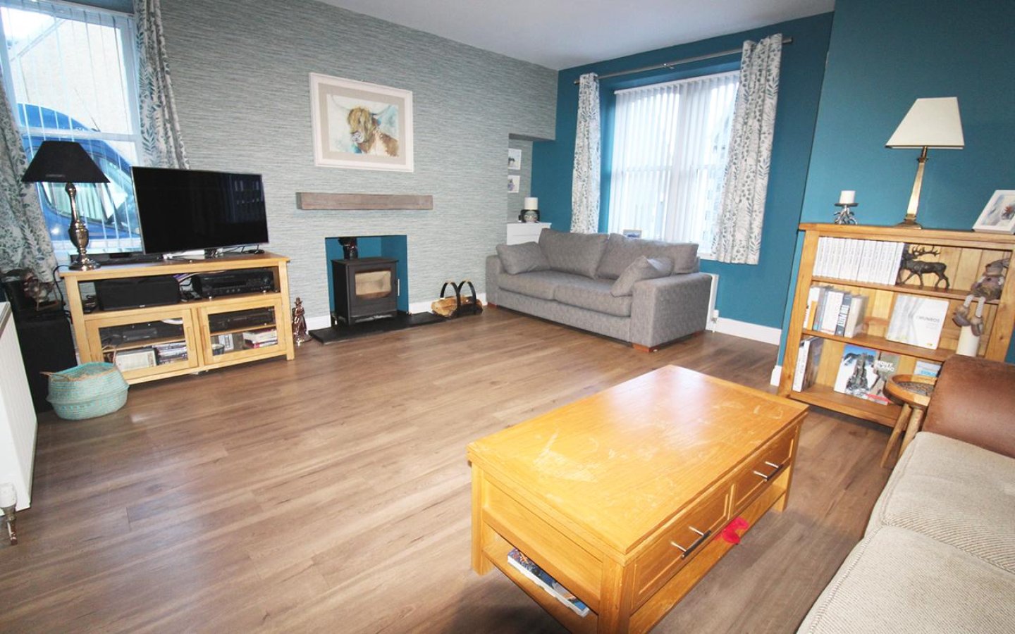 The property is accessed via a wooden glazed door into the carpeted hall which accesses the living room, ground floor bedroom, shower room and the staircase to the first floor. The living room is a lovely bright room with windows to the front and side, decorated in green tones and finished with laminate flooring. The wood burning stove is the focal point of the room and has a wooden mantle above. There is ample space within the lounge for a dining set. A glazed door from the living room leads to the kitchen.
