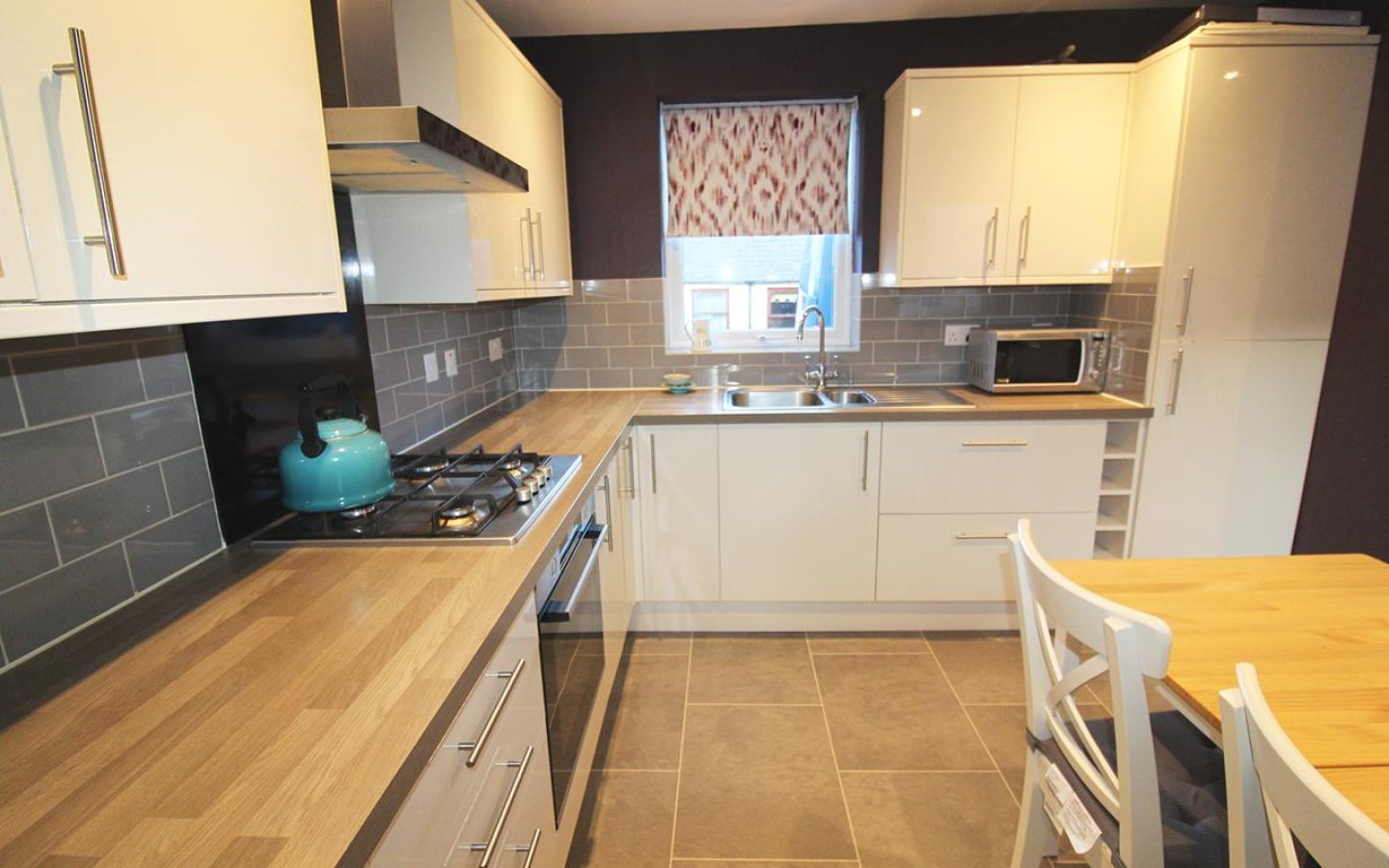 The modern kitchen is fitted with a selection of base and wall mounted units with wood effect worktop and tiled splashback. Integrated appliances include a fridge/freezer, electric oven, gas hob with extractor above. Stainless steel 1 ½ sink with mixer tap. Plumbing for a washing machine is enclosed within a base unit. At the glazed wooden exterior door is an area for coats and shoes. Two windows in the kitchen overlook the garden.