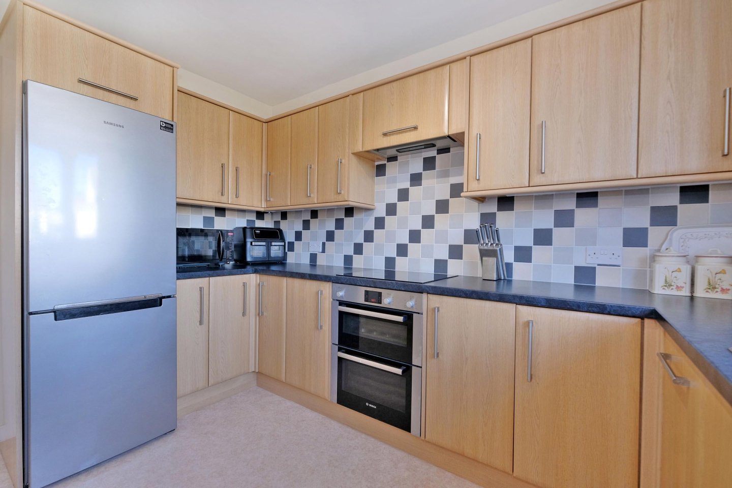 Dining Kitchen: 3.50m x 2.89m (11’6" x 9’6") approx. A bright and spacious kitchen fitted with a range of quality base and wall mounted storage units with Beech effect cabinets, contrasting dark granite effect work-surfaces and ceramic wall tiles. Stainless steel 1 ½ bowl sink and drainer with mixer tap. Samsung induction hob with extractor hood and Bosch double oven below. Samsung upright fridge/freezer. Integrated Lamona dishwasher. Integrated Hoover washing machine. Vinyl floor covering. Radiator. Ample power points. Ceiling spotlight cluster with 3 lights. Complimentary unit lighting. Space for small table and chairs.
